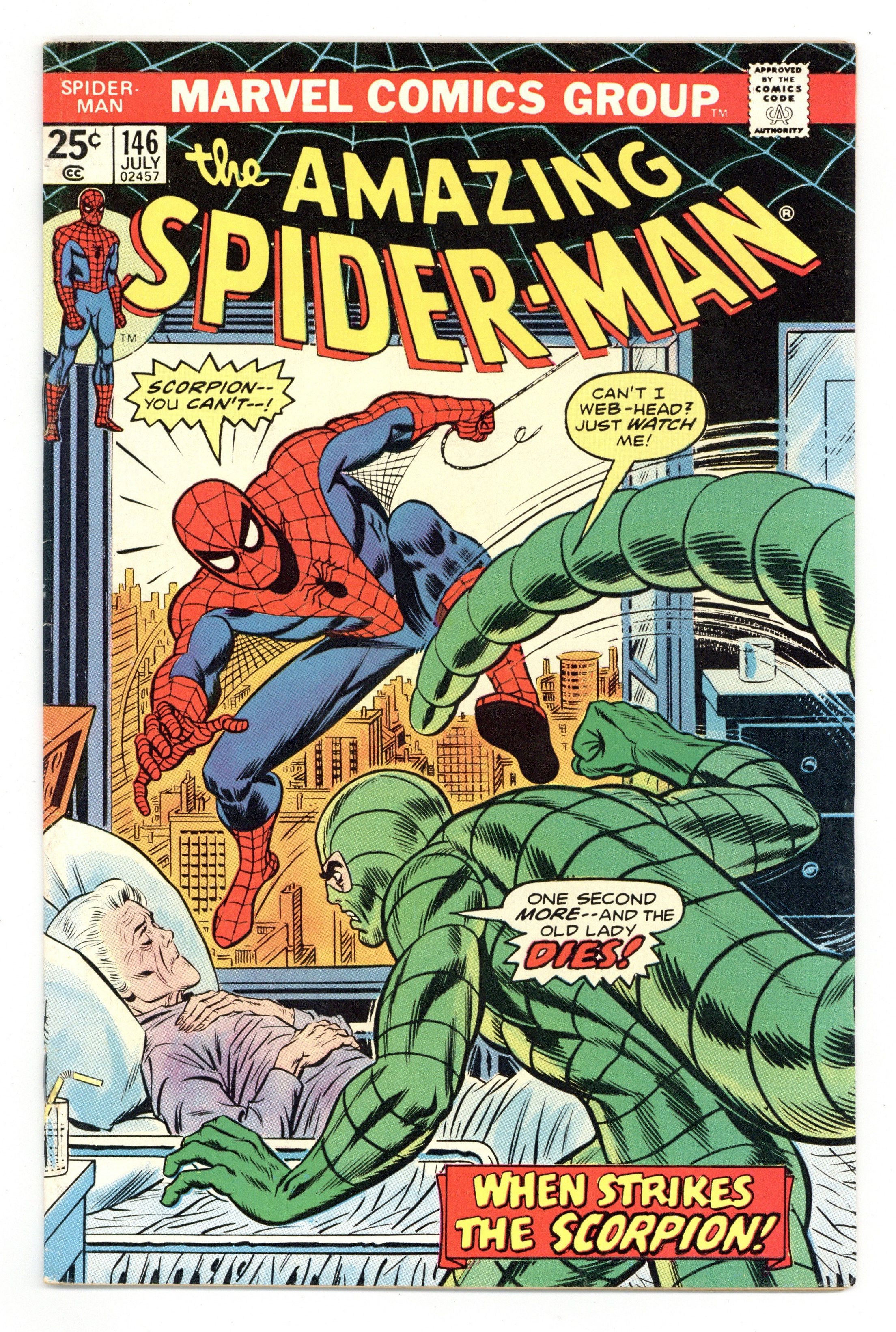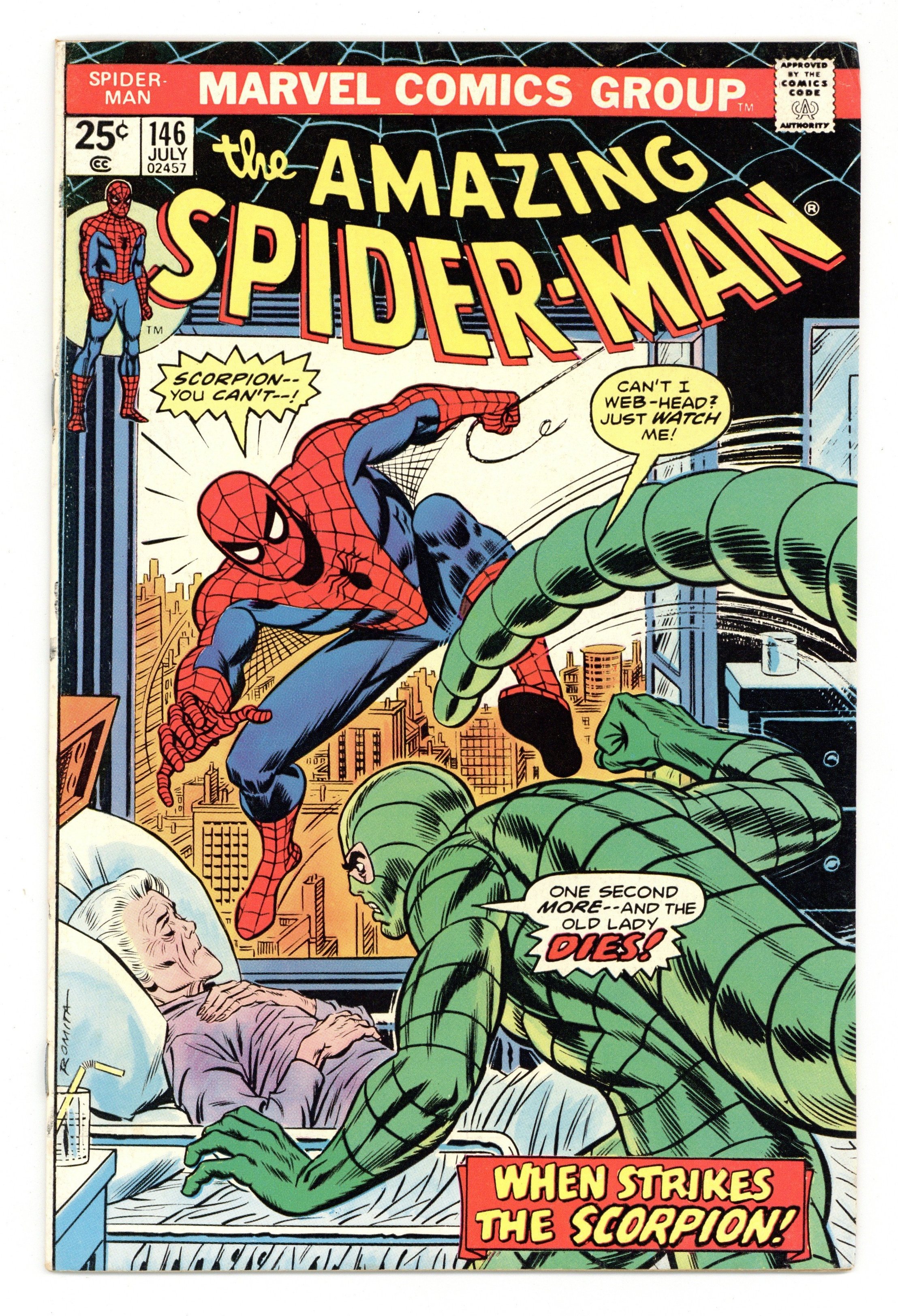 Starts Mar 2 "Scorpion...Where is thy Sting?" Part 2 of 2. Script by Gerry Conway. Pencils by Ross Andru. Inks by John Romita Sr., John Romita, Jr., Mike Esposito, Frank Giacoia, and John Tartaglione. Cover by John Romita Sr. While Aunt May's nephew comes to grips with the return of Gwen Stacy (clone), the devious Jackal once more plots the wall-crawler's violent demise! And this time he uses the unsuspecting Scorpion as his pawn! The Scorpion thought he killed Spidey last issue, but once Mac Gargan learns the truth; he wants another shot! So the Jackal tells him to look in May Parker's hospital room! What a cruel thing to do! And as depicted on the dynamic cover, the Scorpion indeed pays Aunt May a visit! But the super-villain with a sting wasn't counting on a fighting mad web-slinger in the waiting room! The beleaguered Scorpion doesn't stand a chance! Elements of the story continue in Giant-Size Spider-Man 5. (Note: The Scorpion returns in Ms. Marvel (1977 1st series #1. The letters page includes Marvel Value Stamp series A #67 Cyclops by George Tuska. This story was reprinted in Marvel Tales 123.) 36 pages. 25c cover price. Cover price $0.25.