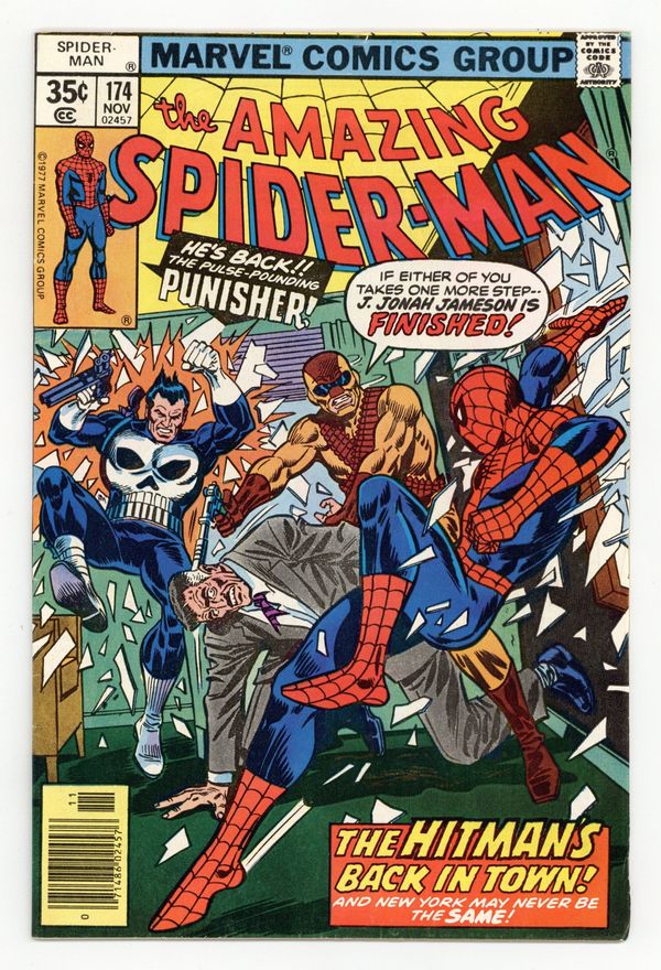 "The Hitman's Back in Town!" Part 1 of 2. Guest-starring the Punisher. Script by Len Wein. Art by Ross Andru (breakdowns), Jim Mooney (finishes), and Tony DeZuniga (finishes). Cover by Ross Andru and Frank Giacoia. The Hitman is back! And he's got a brand new target: J. Jonah Jameson! But there's another gun-toting vigilante back in town too: the Punisher! And he's tracking the Hitman! Mix in the wondrous wall-crawler...and as shown on the dynamic cover, all concerned parties come together in JJJ's corner office! Pandemonium erupts when the bullets start flying! Stay down Jonah! Let Spidey and the Punisher take the hit (man)! Cameo appearances by Harry Osborn, Flash Thompson, Dr. Marla Madison, and Dr. Bart Hamilton. First 35¢ issue. (Notes: The Hitman previously appeared in Spectacular Spider-Man 5. This story was reprinted in Marvel Tales 216.) 36 pages Cover price $0.35.