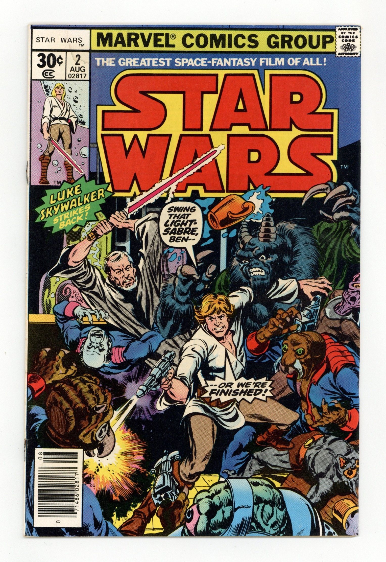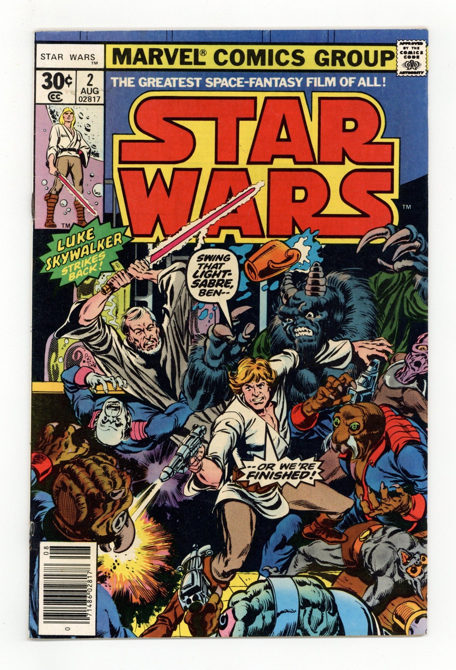 1st printing, standard 30 Cent Newsstand Edition with UPC. A New Hope: Part 2 of 6. "Six against the Galaxy!" Based on the screenplay by George Lucas. Adapted by Roy Thomas. Art by Howard Chaykin and Steve Leialoha. Princess Leia is in the hands of the evil Empire and the sinister Darth Vader. Now it falls on farm boy Luke Skywalker to seize his destiny and rescue her, and save the galaxy. But he can't do it alone. Luckily he'll get some help from old Ben Kenobi, once a great Jedi Knight known as Obi-Wan, Han Solo, a cocky ace pilot and all around scoundrel, Chewbacca, the hulking wookie and loyal co-pilot to Han, and the droids who hold the key to the Empire's defeat, C-3PO and R2-D2. NOTE: Spider-Man stas in a one-page Hostess ad, "Madam Web!" Cover price $0.30.