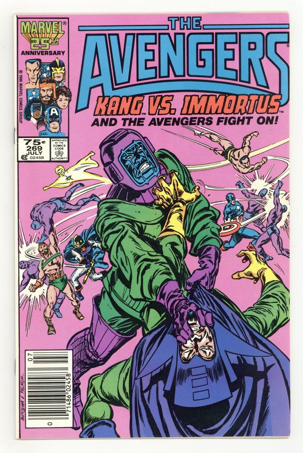 Newsstand Edition. "The Once and Future Kang!" Part 3 of 3. Script by Roger Stern. Art by John Buscema (breakdowns) and Tom Palmer (finishes). Cover by John Buscema and Tom Palmer. In timeless limbo Earth's Mightiest Heroes and their long-time foe, Kang the Conqueror, are captives of the chief council Kang! However, the Lion of Olympus cannot be held for long in a simple paralysis beam! When Hercules breaks free, chaos breaks loose! The Avengers assemble to battle the chief council Kang, while the 41st century Kang also attacks his Kang-brother! Confusing indeed! But in the land of limbo things are seldom what they seem. And eventually the true orchestrator of events is revealed! With Ravonna by his side, Immortus stops the fighting and makes everything all right. Or does he? The Avengers aren't so sure, but of course only time will tell. Flashback cameos by the Fantastic Four, Doctor Doom, and the Pharaoh Rama-Tut. Avengers Lineup: Black Knight, Captain America, Captain Marvel, Hercules, Sub-Mariner, and the Wasp. (Notes: Immortus appears next in Avengers West Coast 48. The significance of this three-part story was the return of Kang the Conqueror as a major villain for the Avengers. This issue sets the stage for many great future encounters.) 36 pages Cover price $0.75.