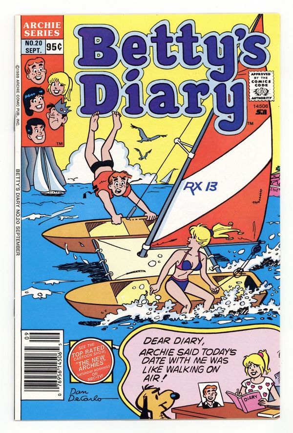 Canadian Price Variant. 95¢ cover price. Cover art by Dan DeCarlo. "A Public Service Message from Archie Comics"; AIDS awareness featuring the Archie gang. "Reggies Gift," script by Sam Kujava, pencils by Bob Bolling, inks by Rudy Lapick; Betty sees Reggie go into a retirement home and follows him in there; She learns that he goes there twice a month to visit an elderly woman who used to babysit him as a child. Sunkist Fun Fruits ad starring Archie and friends. "Diary Dilemma," script and pencils by Dan Parent, inks by Rudy Lapick; Betty and Ethel compare diaries. "T is for Tanning," script by Kathleen Webb, pencils by Bob Bolling, inks by Rudy Lapick; Betty tries to get a tan. "Fashion Bashin", script by Harold Smith, pencils by Bob Bolling, inks by Rudy Lapick; Betty's denim clothes get ripped and damaged with bleach and she accidentally ends up looking fashionable. FruitSlush ad featuring The Archies. "Find a College!" activity page. "Psych-Out," script by Harold Smith, pencils by Bob Bolling, inks by Mike Esposito; Betty's psychoanalysis of her friend's behaviors makes them all avoid her. Betty gives advice to readers on a variety of issues. Post Pebbles Cereal ad featuring The Flintstones. 36 pages, full color. Cover price $0.95.