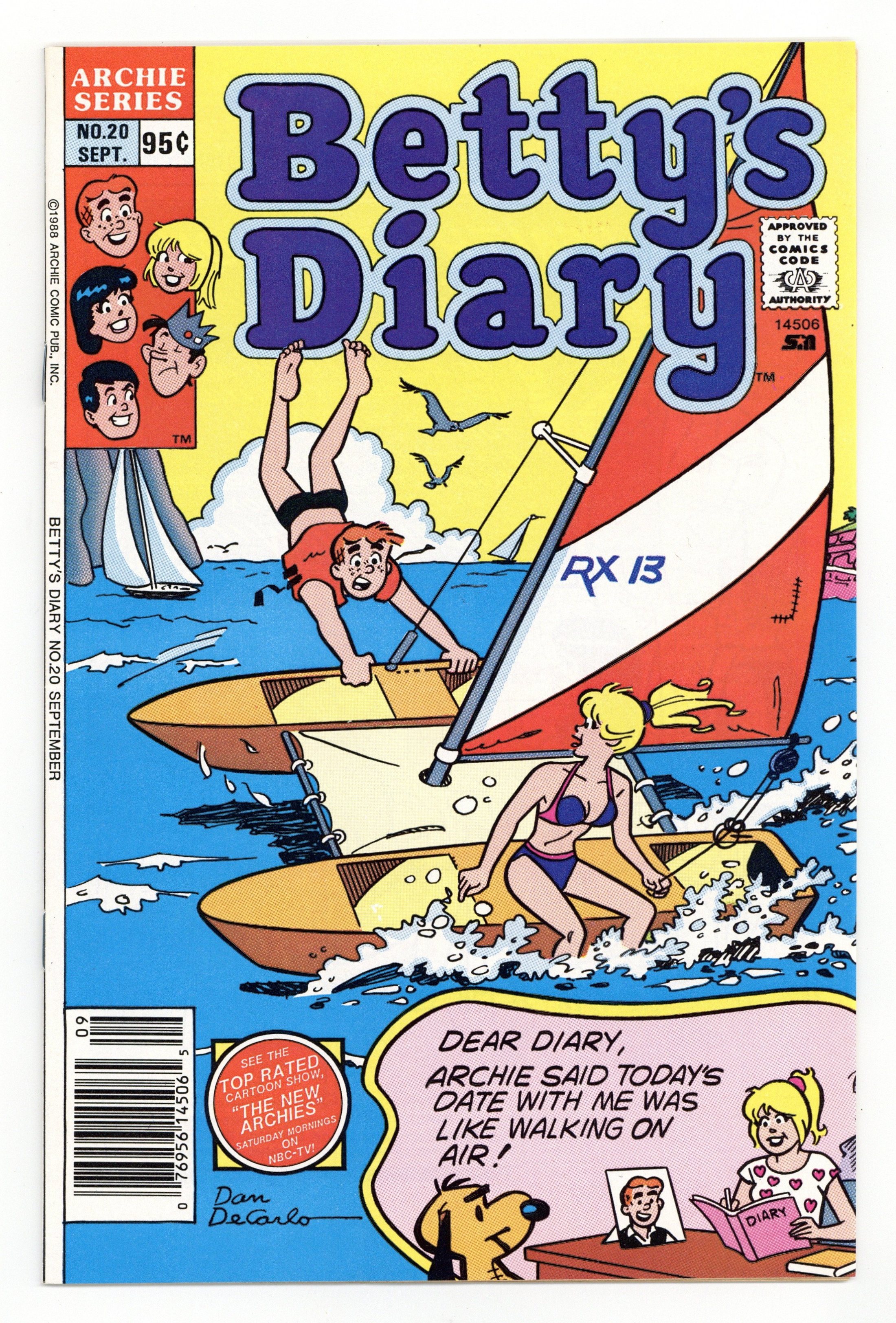 Published Sep 1988 by Archie Publications.$19.50Canadian Price Variant. 95¢ cover price. Cover art by Dan DeCarlo. "A Public Service Message from Archie Comics"; AIDS awareness featuring the Archie gang. "Reggies Gift," script by Sam Kujava, pencils by Bob Bolling, inks by Rudy Lapick; Betty sees Reggie go into a retirement home and follows him in there; She learns that he goes there twice a month to visit an elderly woman who used to babysit him as a child. Sunkist Fun Fruits ad starring Archie and friends. "Diary Dilemma," script and pencils by Dan Parent, inks by Rudy Lapick; Betty and Ethel compare diaries. "T is for Tanning," script by Kathleen Webb, pencils by Bob Bolling, inks by Rudy Lapick; Betty tries to get a tan. "Fashion Bashin", script by Harold Smith, pencils by Bob Bolling, inks by Rudy Lapick; Betty's denim clothes get ripped and damaged with bleach and she accidentally ends up looking fashionable. FruitSlush ad featuring The Archies. "Find a College!" activity page. "Psych-Out," script by Harold Smith, pencils by Bob Bolling, inks by Mike Esposito; Betty's psychoanalysis of her friend's behaviors makes them all avoid her. Betty gives advice to readers on a variety of issues. Post Pebbles Cereal ad featuring The Flintstones. 36 pages, full color. Cover price $0.95.