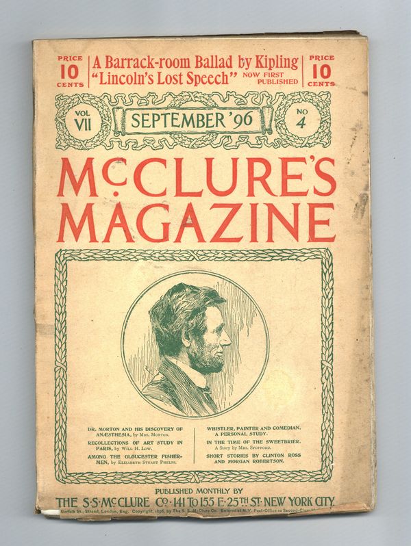 Vol. 7, No. 4 - September 1896. McClure's was a popular mass-market magazine comprised of investigative news articles (often credited as being the origin of muckracking journalism) and fiction stories by popular authors of the day. 6.75" x 9.75", 212 Pages, B&W. Cover price $0.10.