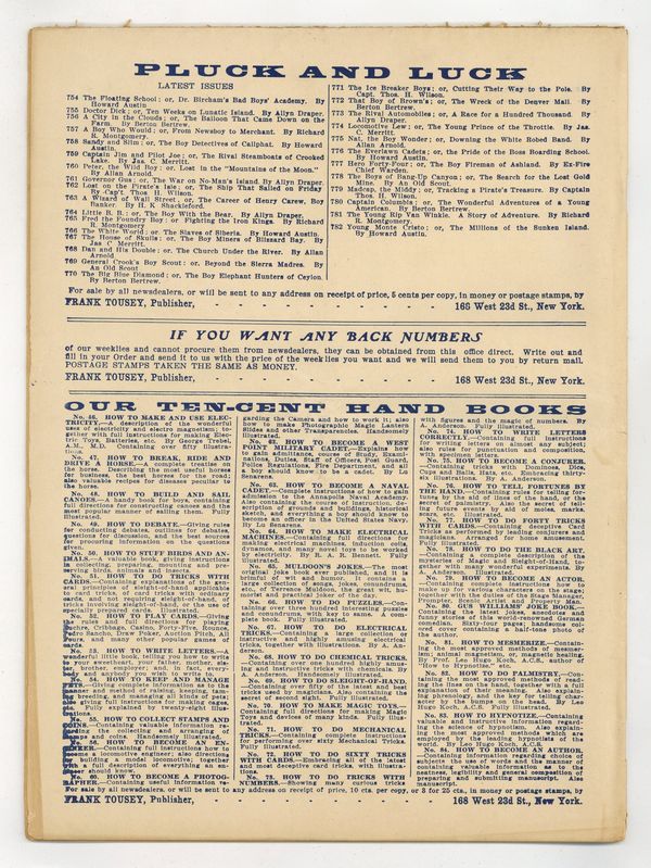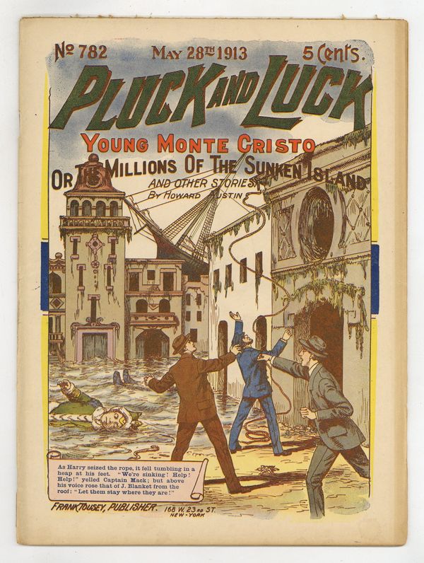 May 28, 1913. "Young Monte Cristo; or, The Millions of the Sunken Island" by Howard Austin. 11" x 8", 36 pages. Cover price $0.05.