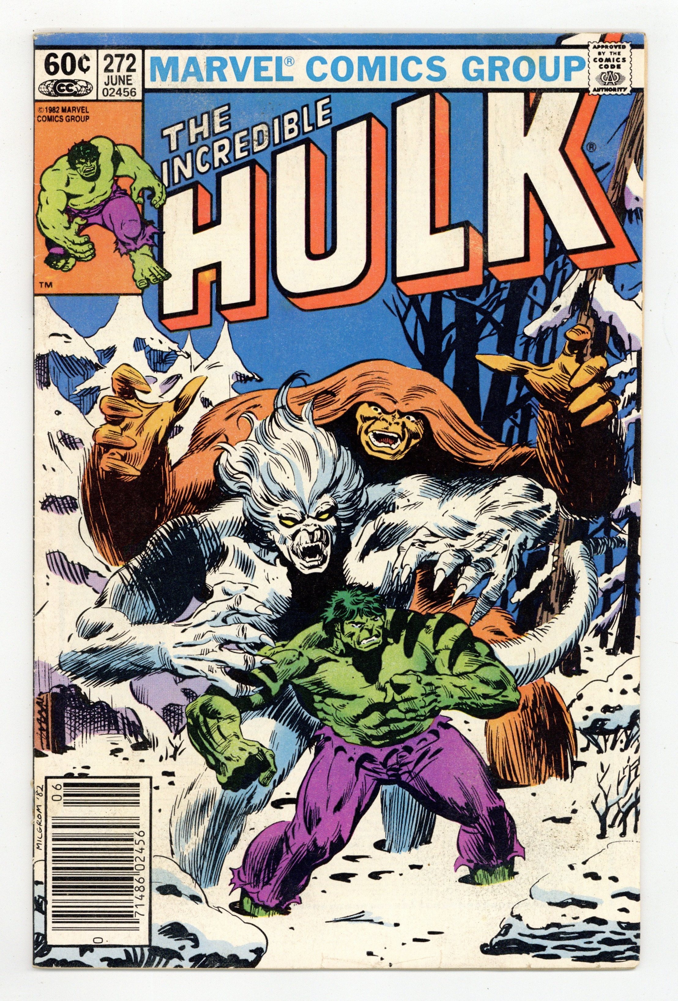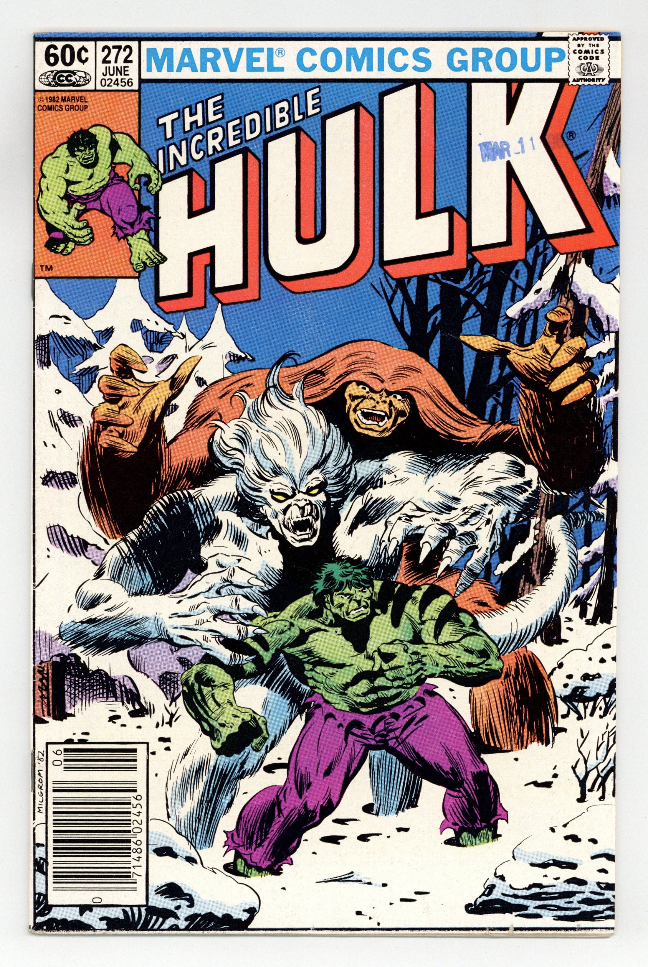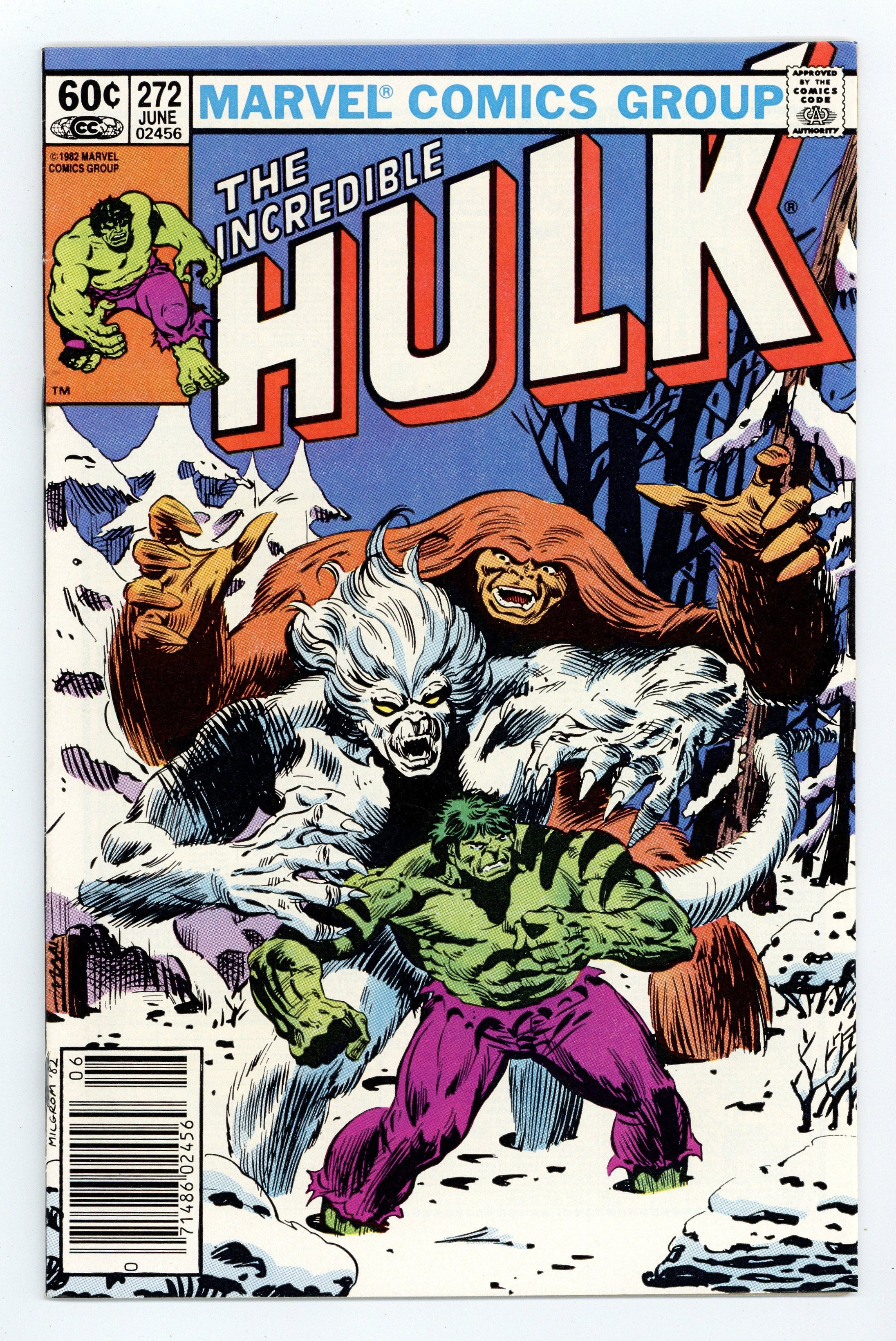 $39.50Newsstand Edition. "Weirdsong of the Wendigo!" Guest-starring Sasquatch. Alpha Flight cameo. Story by Bill Mantlo. Art by Sal Buscema. Bruce Banner arrives back on Earth, but must seek shelter quickly for he has landed in the Canadian wilderness in the middle of winter. Coming across a lone cabin, Banner soon discovers the remains of those murdered within. Then, he comes face-to-face with the horror responsible, the flesh eating Wendigo. Banner is startled as he realizes that his transformation is not triggered, and he is left at the mercy of this ravenous creature. Luckily the Sasquatch is on hand to help. However the Canadian hero will not last long against an opponent that has fought the Hulk to a stand still. Witness for the first time as Banner purposely triggers his transformation into the world's mightiest mortal and retains control over the Incredible Hulk. 36 pages. Cover price $0.60.
