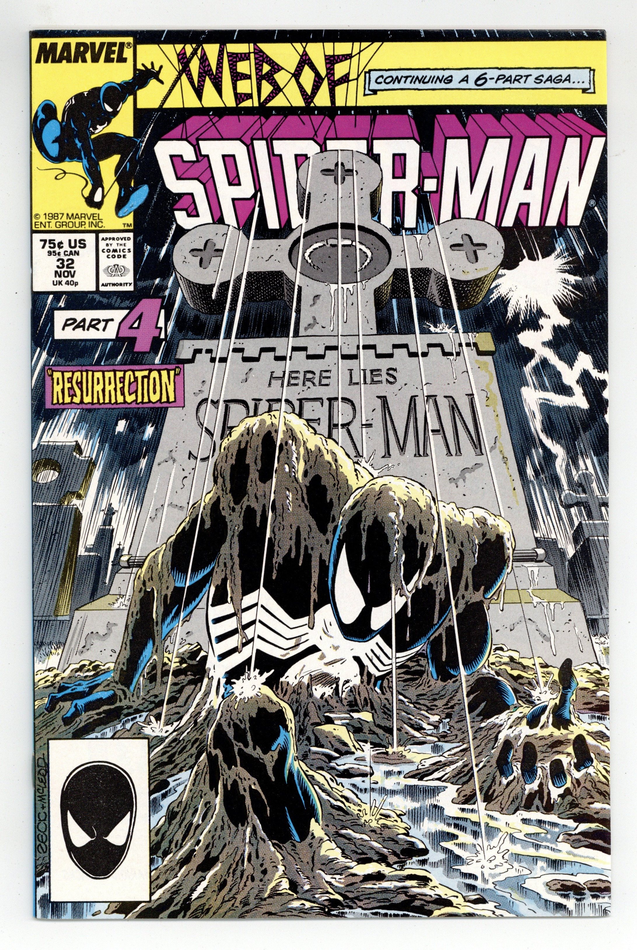 Tags: Spider-Man Kraven's Last Hunt (part 4), Spider-Man$30.00Direct Edition. Kraven's Last Hunt - Part 4 of 6 - "Resurrection" Story by J. M. DeMatteis. Art by Mike Zeck and Bob McLeod. Story continues from Spectacular Spiderman 131. Spider-Man finally awakens from his drug-induced coma and busts out of his coffin! Peter quickly returns to his wife, Mary Jane, who has not seen him in two weeks. Meanwhile, Kraven has been committing crimes in New York City, while dressed as Spider-Man. Story continues in Amazing Spiderman 294. Cover price $0.75.