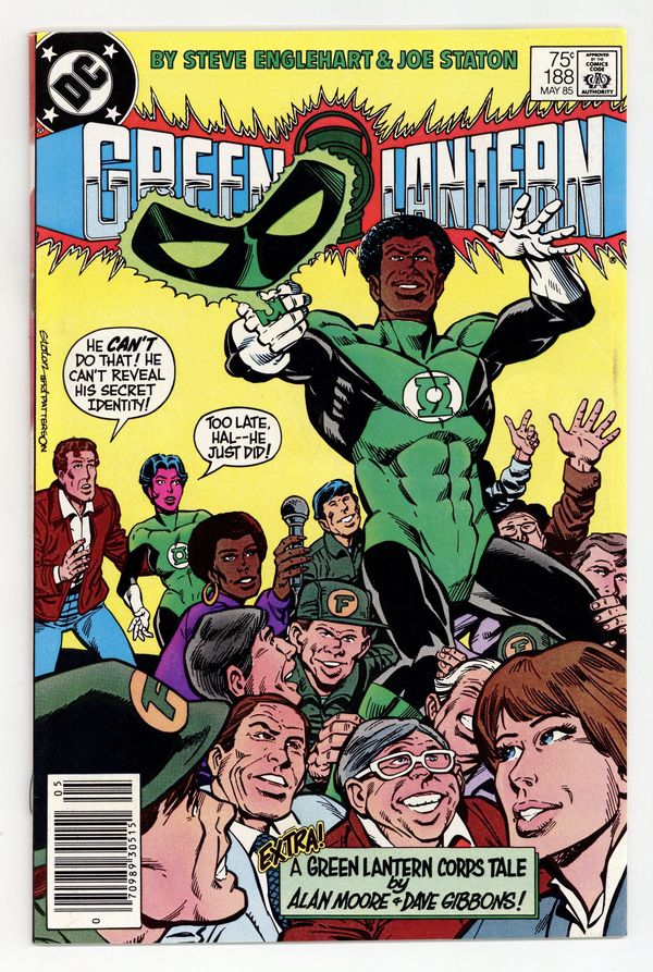 Newsstand Edition. "Decent Exposure." After revealing his Green Lantern identity, John Stewart battles Sonar. Script by Steve Englehart, pencils by Joe Staton, inks by Bruce Patterson. "Mogo Doesn't Socialize." A warrior looking to fight a Green Lantern battles Mogo, only to regret it. Script by Alan Moore, art by Dave Gibbons. Cover by Staton and Patterson. Cover price $0.75.