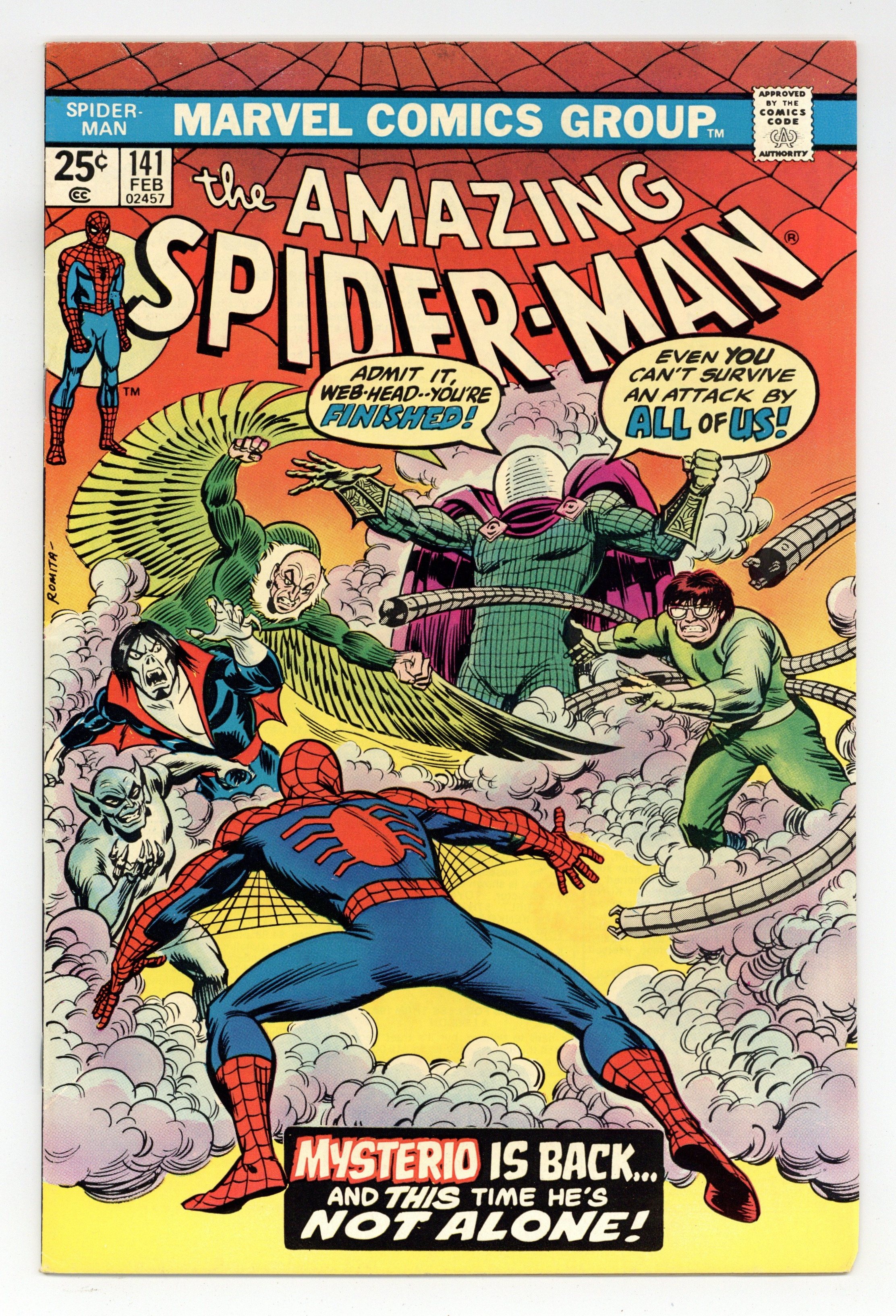 First appearance of the second Mysterio (aka Danny Berkhart) in "The Man's Name Appears to Be...Mysterio!" Part 1 of 2. Script by Gerry Conway. Pencils by Ross Andru. Inks by Frank Giacoia and Dave Hunt (backgrounds). Cover by John Romita. The Amazing Spider-Man decides to take the Spider-Mobile for a spin! But after evading New York's Finest, he accidentally crashes into the Hudson River! Scratch one Spider-Mobile! The mist and fog tricked the web-slinger! The next day when the wall-crawler sees apparitions on his deadly foes including the Green Goblin, Dr. Octopus, and the Molten Man; he realizes that the Master of Illusion has returned! Can Spider-Man stop the madness...before he goes mad himself? Cameo appearances by Mary Jane Watson, Betty Brant, Ned Leeds, Joe Robertson, J. Jonah Jameson, and Professor Miles Warren. (Notes: The web-slinger previously battled the original Mysterio in Amazing Spider-Man 67. The letters page includes Marvel Value Stamp series A #35 Killraven by Herb Trimpe and Frank Giacoia. This story was reprinted in Marvel Tales 118.) 36 pages. 25c cover price. Cover price $0.25.