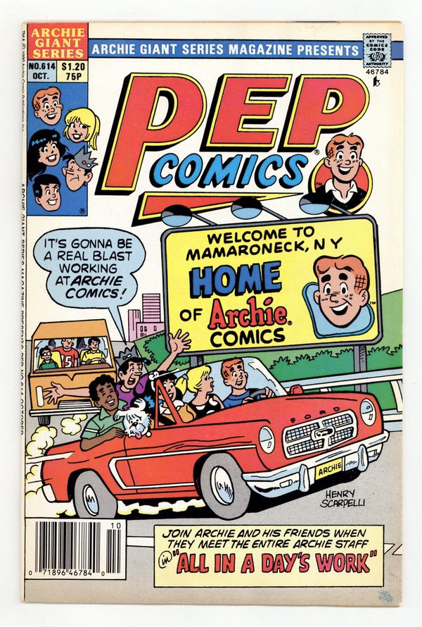 Published Oct 1990 by Archie Publications.$5.00Canadian Price Variant. $1.20 cover price. PEP Comics. Cover by Henry Scarpelli. "All in a Day's... Work?", script by Karen A. Szczuka, art by Henry Scarpelli; The teens from Riverdale High travel to the offices of Archie Comics to work for the summer, but things don't work out very well; appearances by many Archie Comics employees and creators, named and unnamed. Archie Club News. 36 pgs., full color. Cover price $1.20.