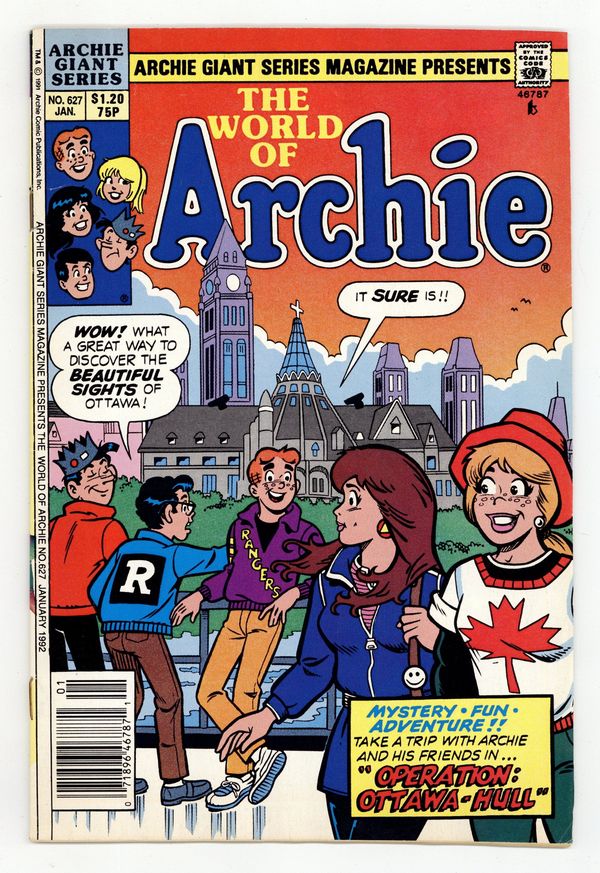 Published Jan 1992 by Archie Publications.$4.49Canadian Price Variant. $1.20 cover price. The World of Archie. "Operation: Ottawa-Hull" Part 1, script by George Gladir, pencils by Tim Kennedy, inks by Jon D'Agostino; After Archie, Dilton and Jughead win a trip to Ottawa, Mr. Lodge gets Archie to deliver business microfilm data inside a hockey puck. "Operation: Ottawa-Hull" Part 2, script by George Gladir, pencils by Tim Kennedy, inks by Jon D'Agostino; While in Ottawa, two thugs attempt to steal Mr. Lodge's microfilm data hockey puck from Archie. "Operation: Ottawa-Hull" Part 3, script by George Gladir, pencils by Tim Kennedy, inks by Jon D'Agostino; In Ottawa, Archie, Jughead and Dilton encounter the microfilm puck thieves once again but after Jughead switches the puck bags, they steal the wrong pucks. "Operation: Ottawa-Hull" Part 4, script by George Gladir, pencils by Tim Kennedy, inks by Jon D'Agostino; In Ottawa, Archie, Jughead and Dilton attempt to retrieve the microfilm puck from Donna before the thieves do. 36 pgs., full color. Cover price $1.20.