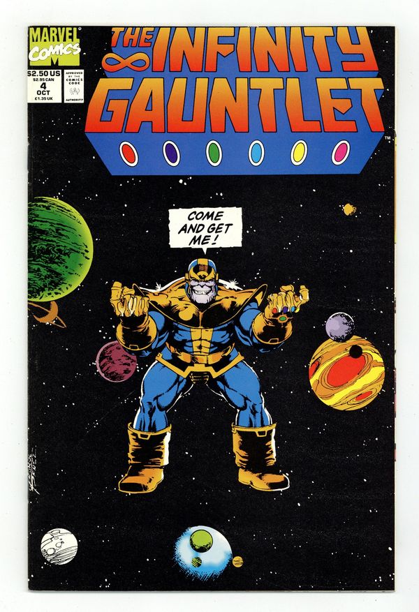 Ends Apr 16 8:26 PM CST Bid History 8 bids Current Bid $31 Your Secret Max Bid If you'd like to bid, please log in or register. Direct Edition. Part 4 of 6 - "Cosmic Battle on the Edge of the Universe!" Story by Jim Starlin. Art by Ron Lim, George Perez, Joe Rubinstein, Bruce N. Solotoff. The surviving heroes of Earth mount an all-out assault on the Mad Titan, Thanos, and the power of his Infinity Gauntlet. But do even the most powerful heroes in the Marvel Universe have enough might to topple this nigh-omnipotent madman? Meanwhile, the mysterious man known as Adam Warlock waits and watches in the wings. What could he possibly have up his sleeve? 48 pages. Cover price $2.50.