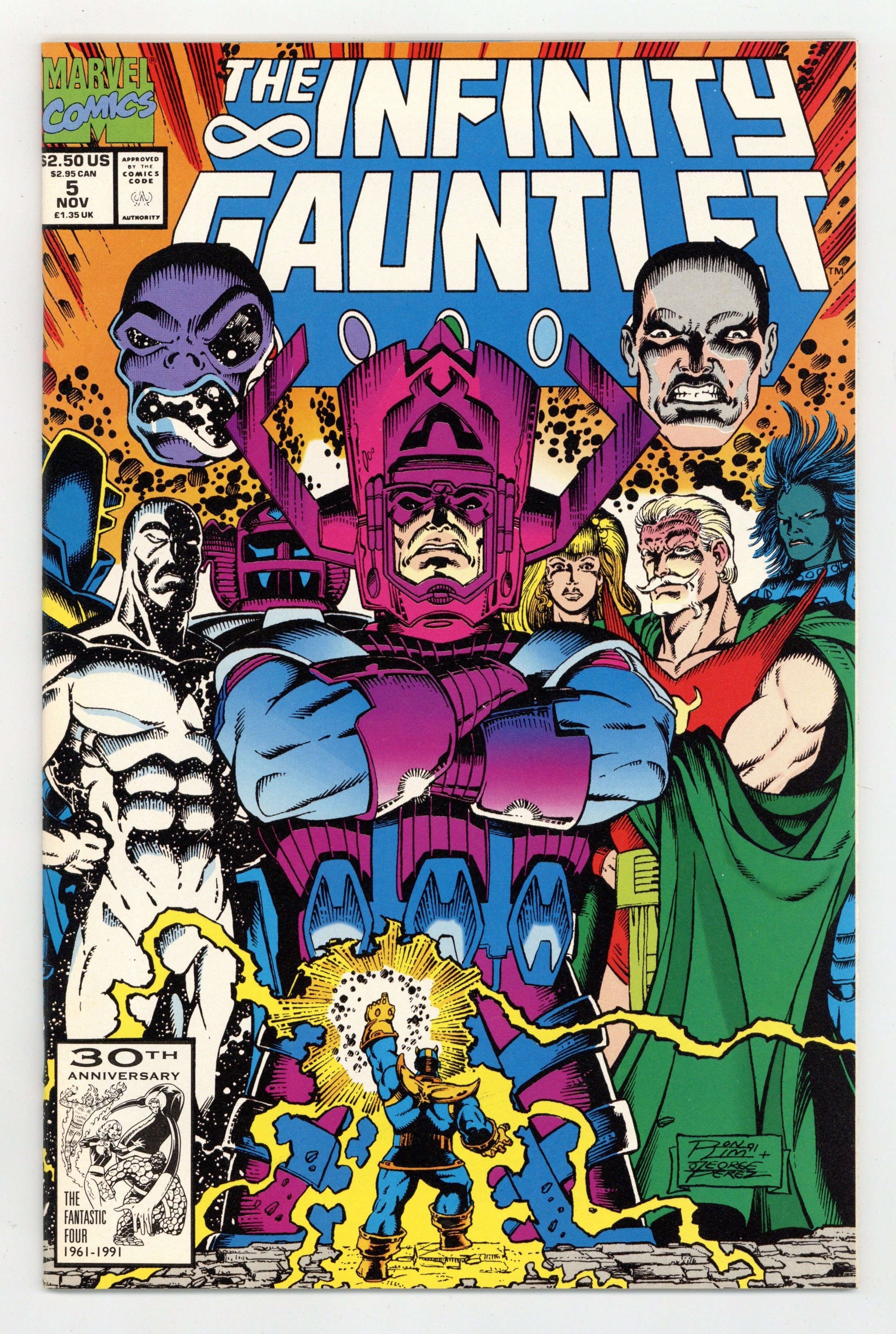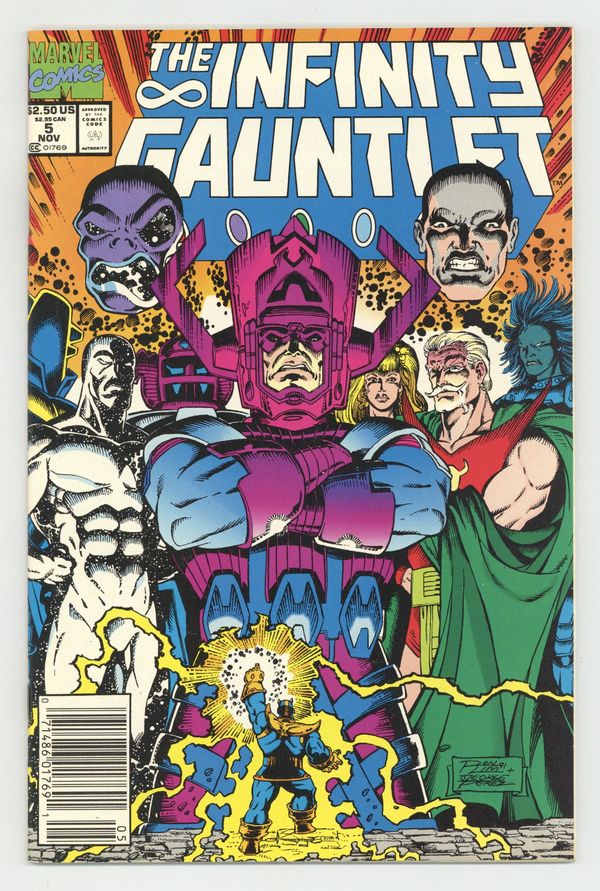 Tags: Infinity Gauntlet (part 5)$22.50Part 5 of 6. "Astral Conflagration!" Story by Jim Starlin. Art by Ron Lim and Joe Rubinstein. The heroes of Earth mounted an all-out assault on Thanos and the power of his Infinity Gauntlet. They failed. Now, the Mad Titan stands defiantly before the cosmic gods of the universe. It's Thanos vs. the Stranger, Lord Order and Master Chaos, Chronos, the Celestials, Mistress Love and Sire Hate, Mephisto, Eon, Galactus, Lady Death, and Eternity in a battle that could very well mean the end of everything. However, an unexpected turn of events will change the playing field and nothing will ever be the same again. 48 pages. Cover price $2.50.