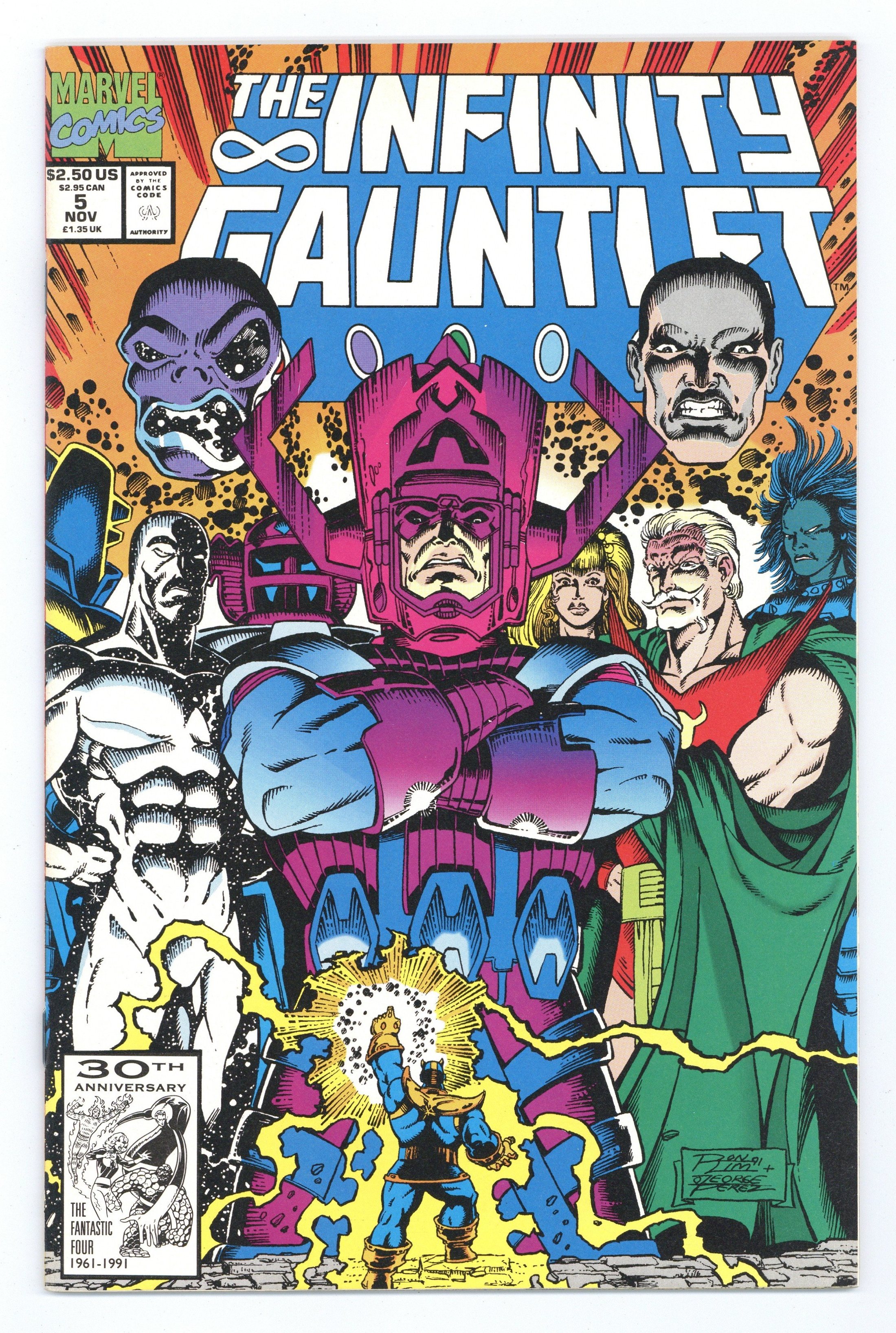 Part 5 of 6. "Astral Conflagration!" Story by Jim Starlin. Art by Ron Lim and Joe Rubinstein. The heroes of Earth mounted an all-out assault on Thanos and the power of his Infinity Gauntlet. They failed. Now, the Mad Titan stands defiantly before the cosmic gods of the universe. It's Thanos vs. the Stranger, Lord Order and Master Chaos, Chronos, the Celestials, Mistress Love and Sire Hate, Mephisto, Eon, Galactus, Lady Death, and Eternity in a battle that could very well mean the end of everything. However, an unexpected turn of events will change the playing field and nothing will ever be the same again. 48 pages. Cover price $2.50.