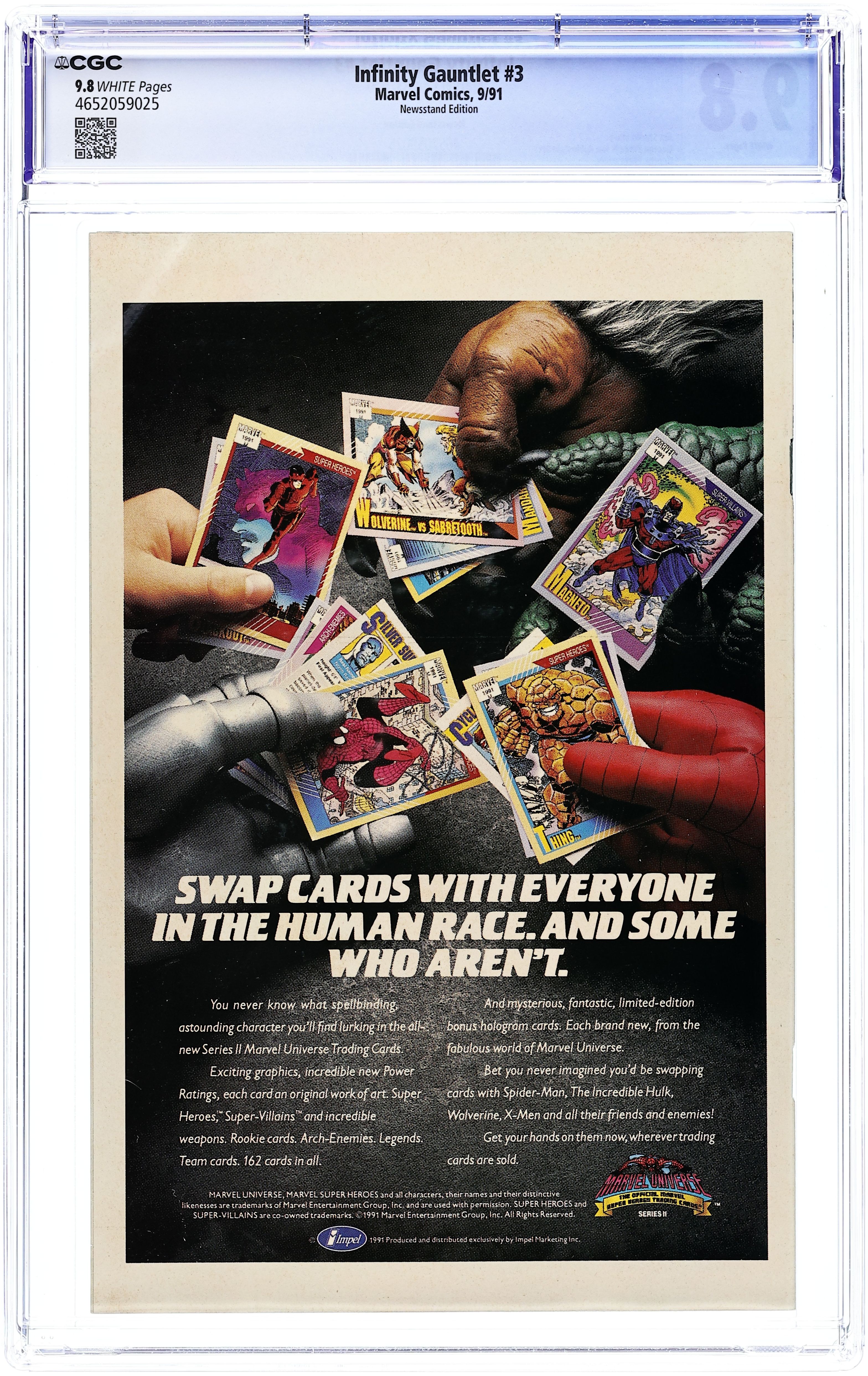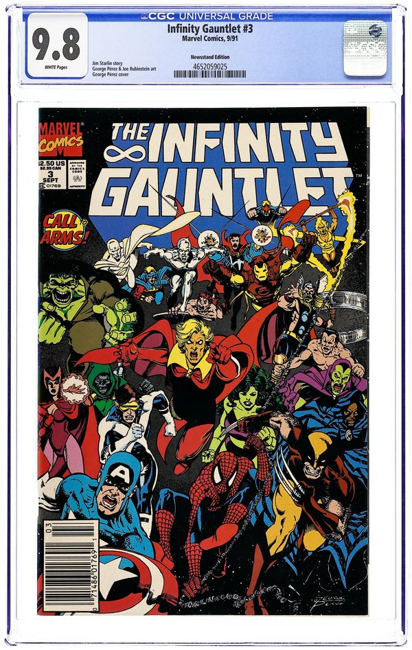 Newsstand Edition. Part 3 of 6. "Preparations for War!" Story by Jim Starlin. Art by George Perez and Joe Rubinstein. The remaining heroes of Earth marshal their forces for a full out assault on the Mad Titian. But past transgressions threaten to tear them apart from the inside. Meanwhile, Adam Warlock, Silver Surfer, and Quasar attend a convergence of the cosmic gods of the universe. If the heroes fall then these unbelievably powerful beings will engage Thanos in a battle that could tear apart the very fabric of reality. 48 pages. Cover price $2.50.