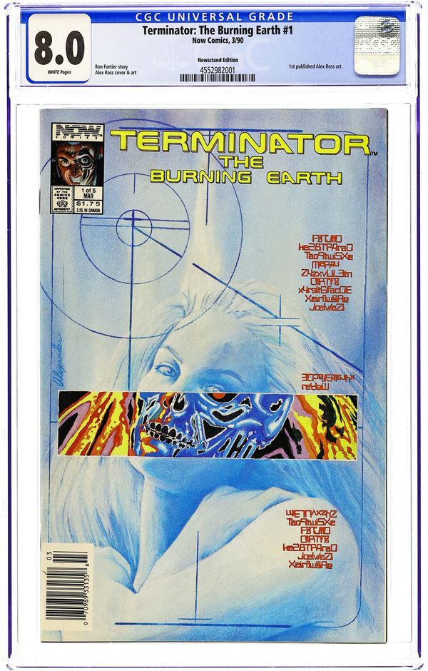 Newsstand Edition. Part 1 of 5. Story by Ron Fortier. Art and cover by Alex Ross (1st published work). Ten years after the original Terminator movie, John Connor starts to consider his situation hopeless. Then, a new assault by Skynet reignites his passion for survival. 32 pages. Full color. Cover price $1.75.