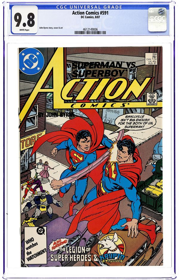 Superman is transported to another time when he tries to catch up with Superboy and the Legion of Super-Heroes in "Past Imperfect." Continued from Superman (1987) #8. Concludes in Legion of Super Heroes (1984 3rd Series) #38. Time Trapper, Krypto appearances. Story, pencils & figure inks by John Byrne, background inks by Keith Williams. Cover by Byrne. 36 Pages, Full Color, $0.75. Cover price $0.75.