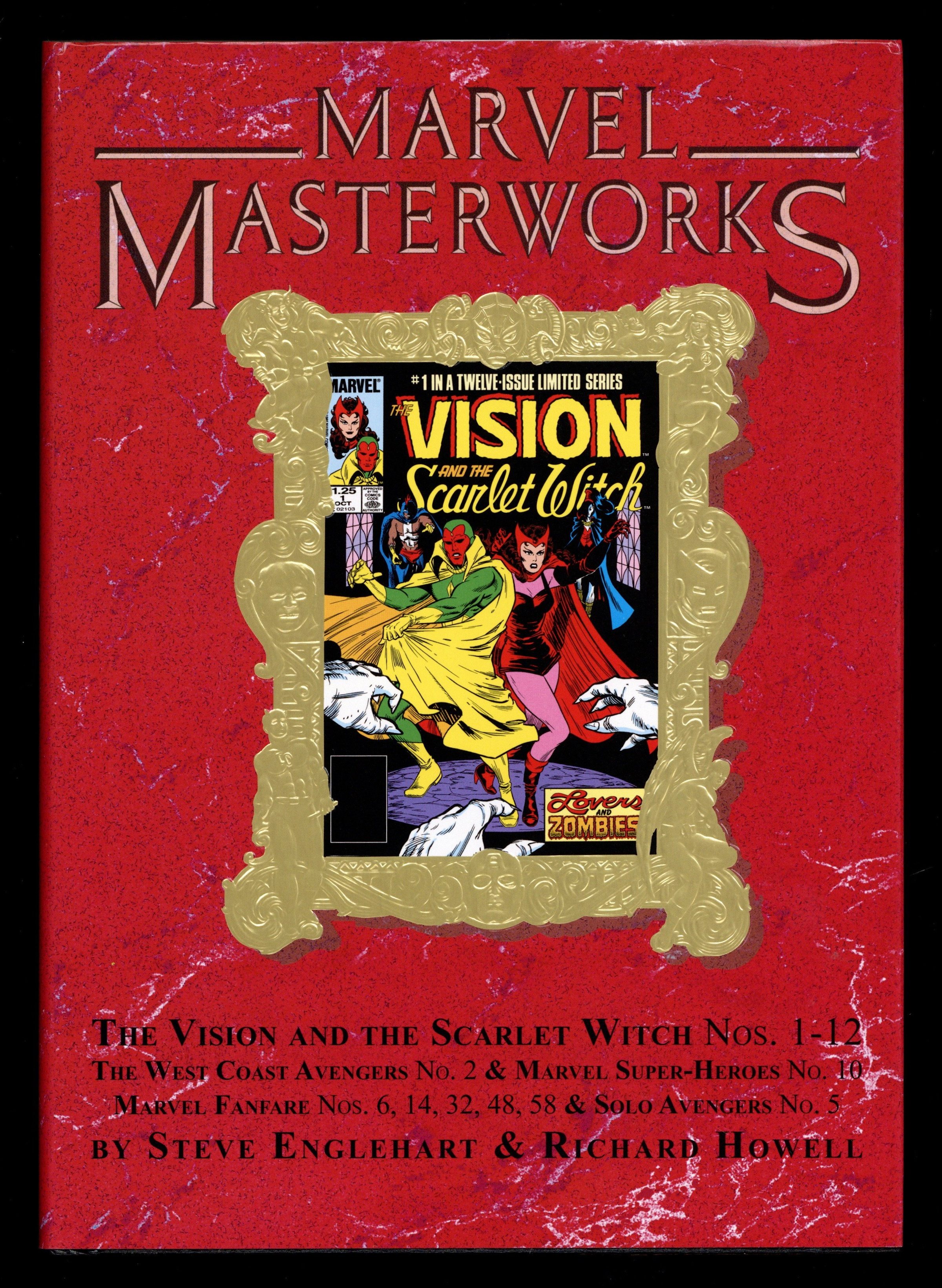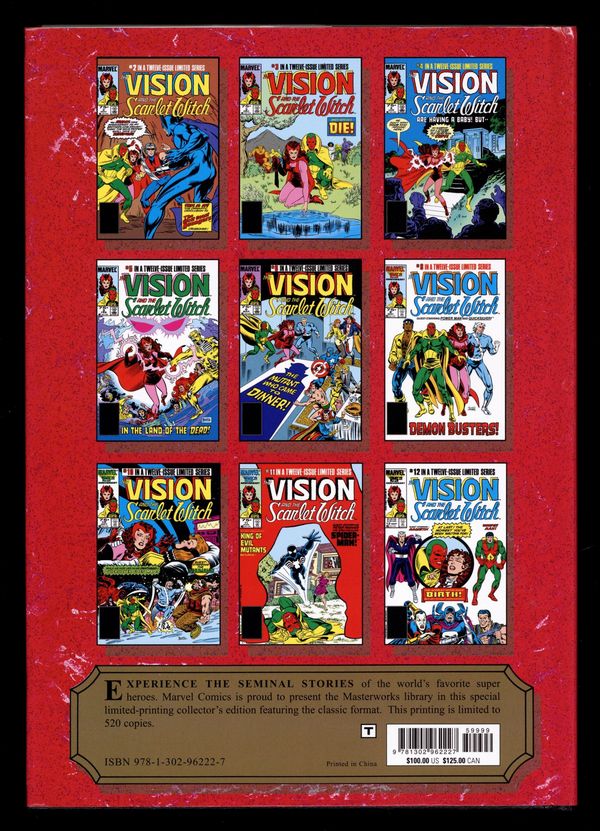 Volume 376 - 1st printing. "Vision and the Scarlet Witch: Book 1!" Collects Vision and the Scarlet Witch (1985 2nd Series) #1-12; Avengers West Coast (1985-1994) [The West Coast Avengers] #2 and stories from Marvel Fanfare (1982-1992 1st Series) #6, 14, 32, 48 and 58; Marvel Super Heroes (1990-1993 2nd Series) #10; Solo Avengers (1987-1989 Marvel) #5 and What The --?! (1988) #3. Written by Steve Englehart, Mike W. Barr, Sandy Plunket, Roger McKenzie, Michael Higgins, Bill Mantlo, Dennis Mallonee, and Richard Howell. Art by Richard Howell, Al Milgrom, Sandy Plunkett, Rick Leonardi, Paul Smith, Ron Wilson, Mike Mignola, John Ridgway, Andy Mushynsky, Jim Mooney, Jack Abel, Mike Esposito, Frank Springer, Kim DeMulder, P. Craig Russell, Joe Rubinstein, Jim Sanders III, Armando Gil, and Joe Sinnott. Cover by Richard Howell. Introduction by Jim Salicrup. These comics laid the groundwork for MARVEL STUDIOS' WANDAVISION and the upcoming AGATHA ALL ALONG! The Marvel Masterworks are proud to present a massive volume collecting the adventures of the Avengers icons Vision and the Scarlet Witch! We're including not just the 1985 maxiseries that went on to inspire MARVEL STUDIOS' WANDAVISION, but also rare, never-before-reprinted stories that chronicle the couples' search for acceptance. With rich storytelling and vibrant artwork, these tales explore themes of love, duty and identity - showcasing the enduring bond between the two iconic characters. The Vision's origins are explored, while the Scarlet Witch expands her powers in new and sometimes shocking ways. But Wanda's brother Quicksilver's prejudice risks splitting their family apart. Will his choices set him on a dark path? And with Wanda's mystic pregnancy nearing term, what will Magneto's return mean for the mother-to-be? Hardcover, 488 pages, full color. Rated T Cover price $100.00.