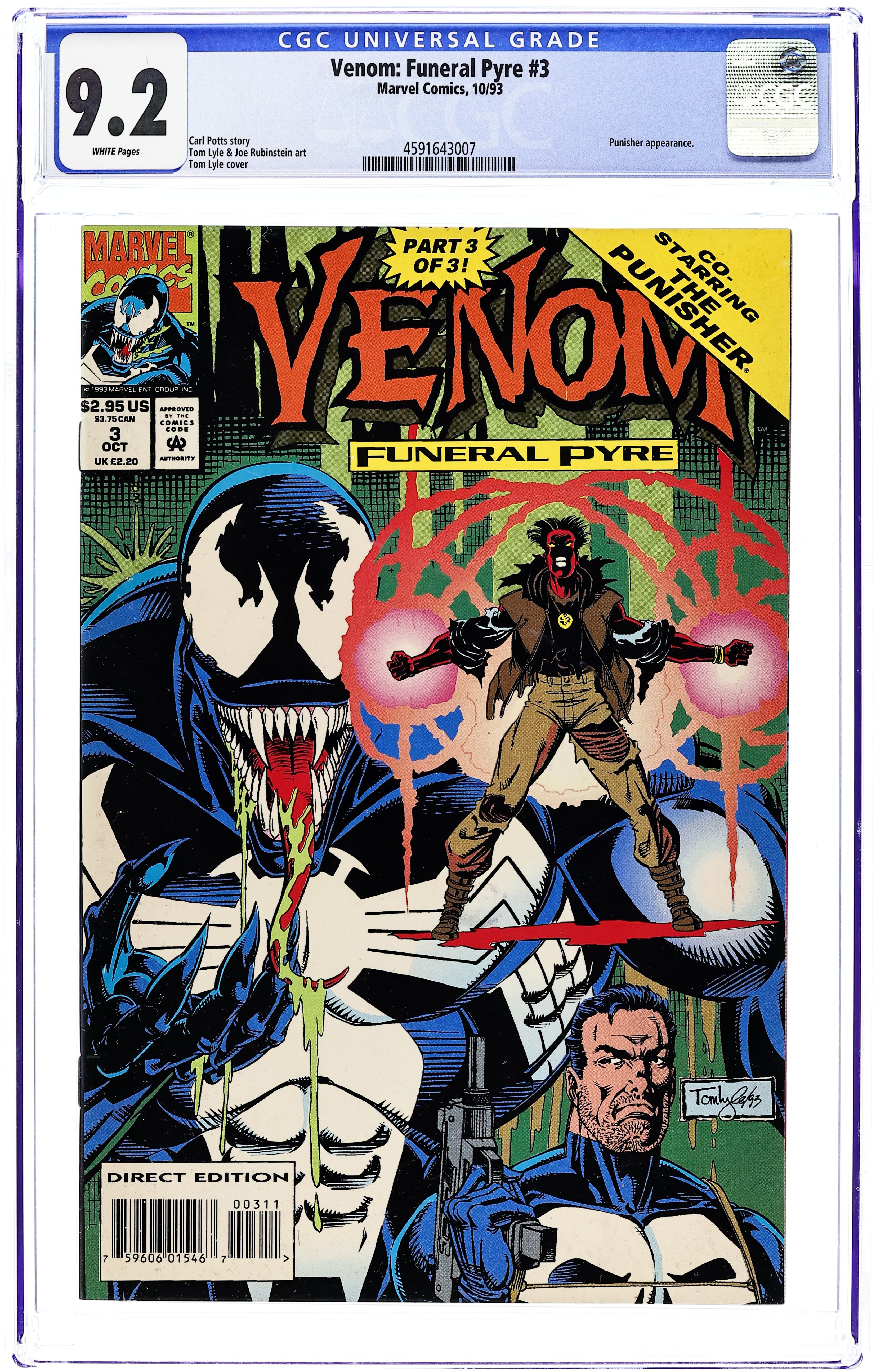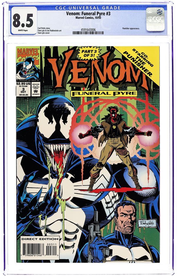 Direct Edition. The dynamic limited series concludes. The Punisher and Venom go head to head before teaming up to take on Pyre, the brutal new menace! Written by Carl Potts. Art by Tom Lyle and Joe Rubinstein. Cover by Tom Lyle. Cover price $2.95.