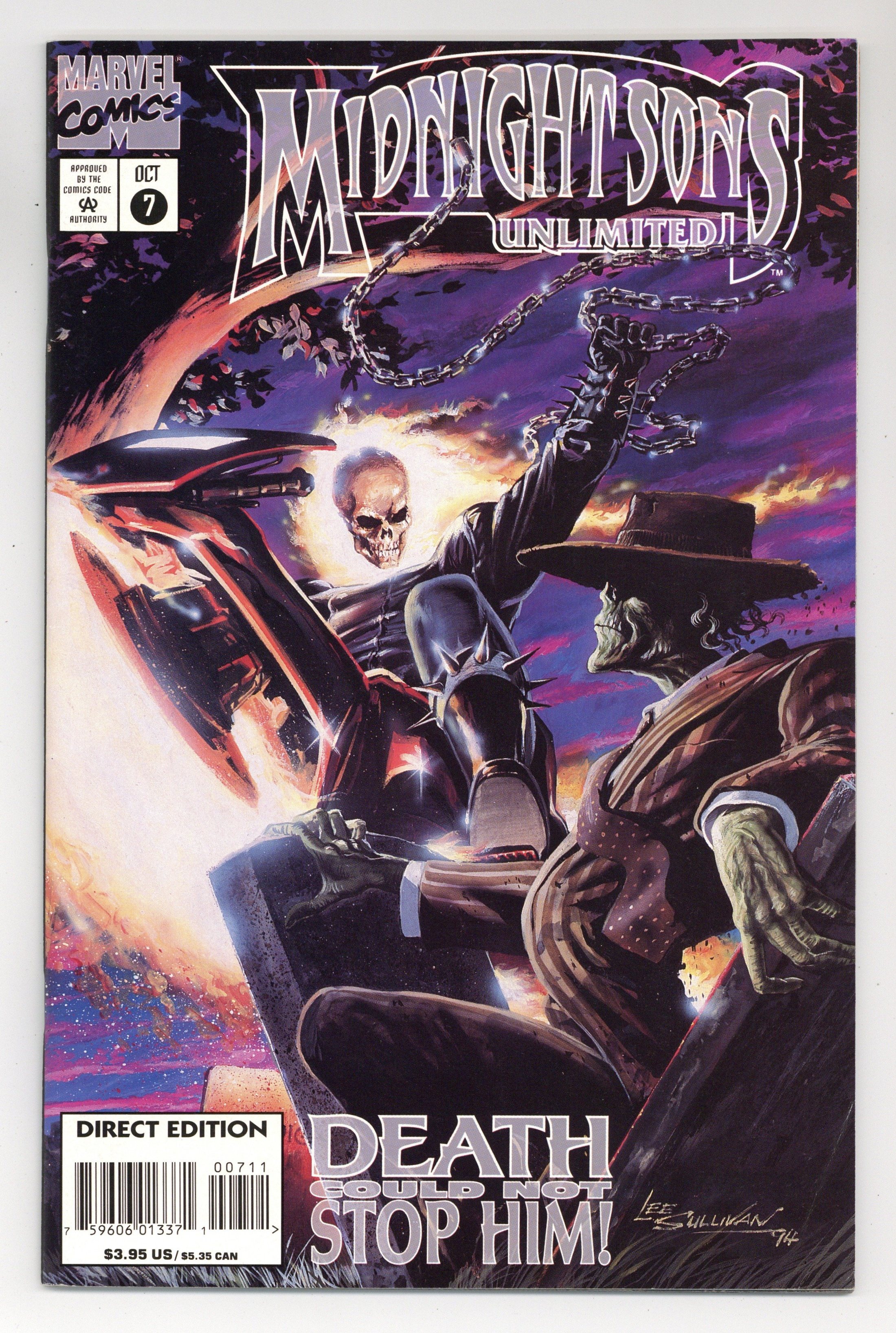 Cover by Lee Sullivan. When the Spirit Moves, Part I: Retribution starring Ghost Rider, Morbius, and Jericho Drumm, script by Scott Benson, art by Daerick Gross and Andrew Pepoy. When the Spirit Moves, Part II: Recollection, script by Scott Benson, art by Duncan Rouleau and Marie Severin; A flashback to 1952 shows the true story of what happened to Nathaniel Mare and Ellery Snow. Peter Sanderson answers continuity questions. When the Spirit Moves, Part III: Resolution, script by Scott Benson, art by Daerick Gross and Andrew Pepoy; The heroes stop Nathaniel Mare and Ellery Snow before they can kill an innocent woman. Blood Brothers starring, script by Dan Abnett, art by Nick Napolitano and Bob Downs. Moon-Jack starring Werewolf by Night, script by Kev F. Sutherland, art by Jake Jacobsen and Kev F. Sutherland. 68 pgs., full color. $3.95. Cover price $3.95.
