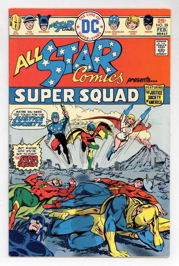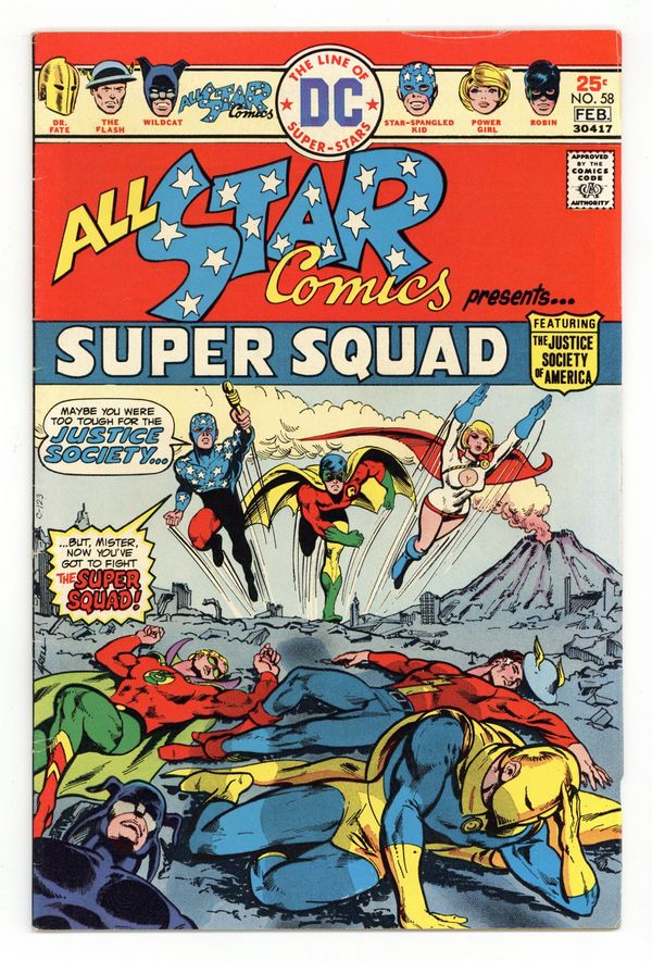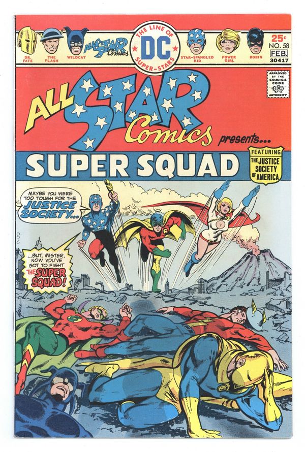 Starts Dec 8 1st appearance of Power Girl. Cover art by Mike Grell. The Super Squad! starring the All Star Super Squad, script by Gerry Conway, pencils by Ric Estrada, inks by Wally Wood; Power Girl describes the Super Squad as a strike force composed of the JSA and the three younger heroes--Robin, Power Girl, and Star-Spangled Kid. Letters from Roy Thomas and Jerry Bails. The Captive Commissioner Hostess ad starring Batman, pencils by Curt Swan, inks by Vince Colletta. 36 Pages, Full Color. Cover price $0.25.