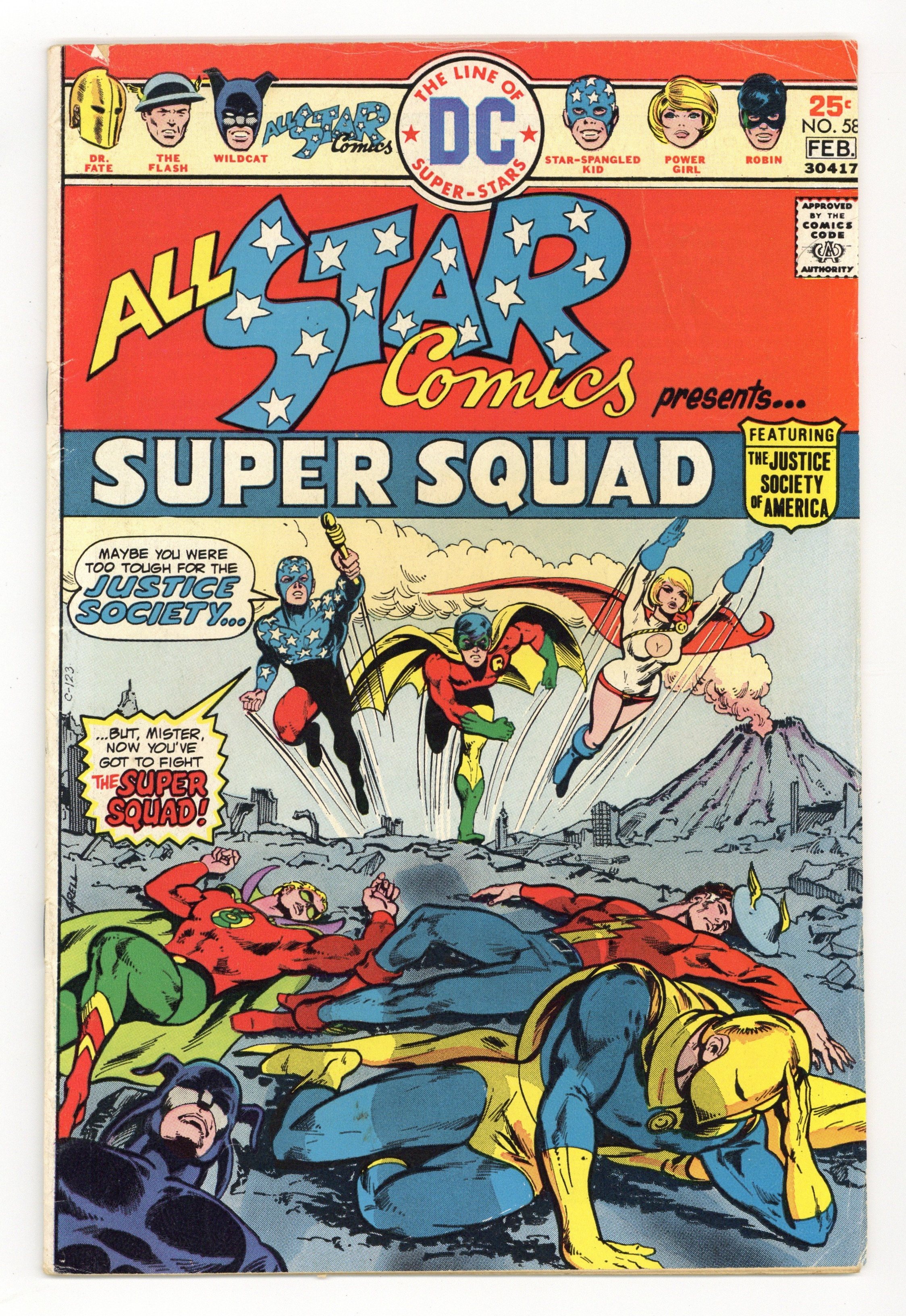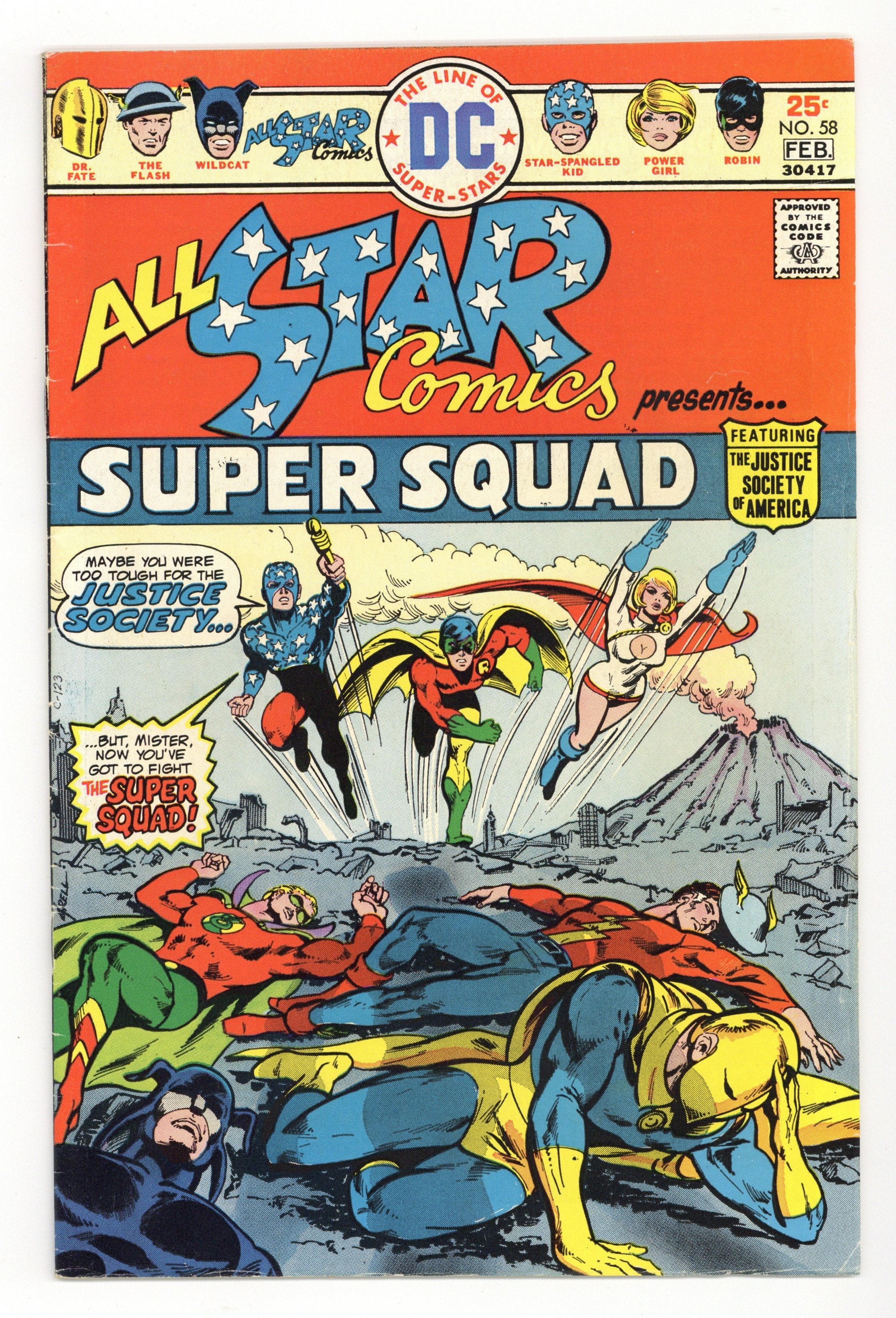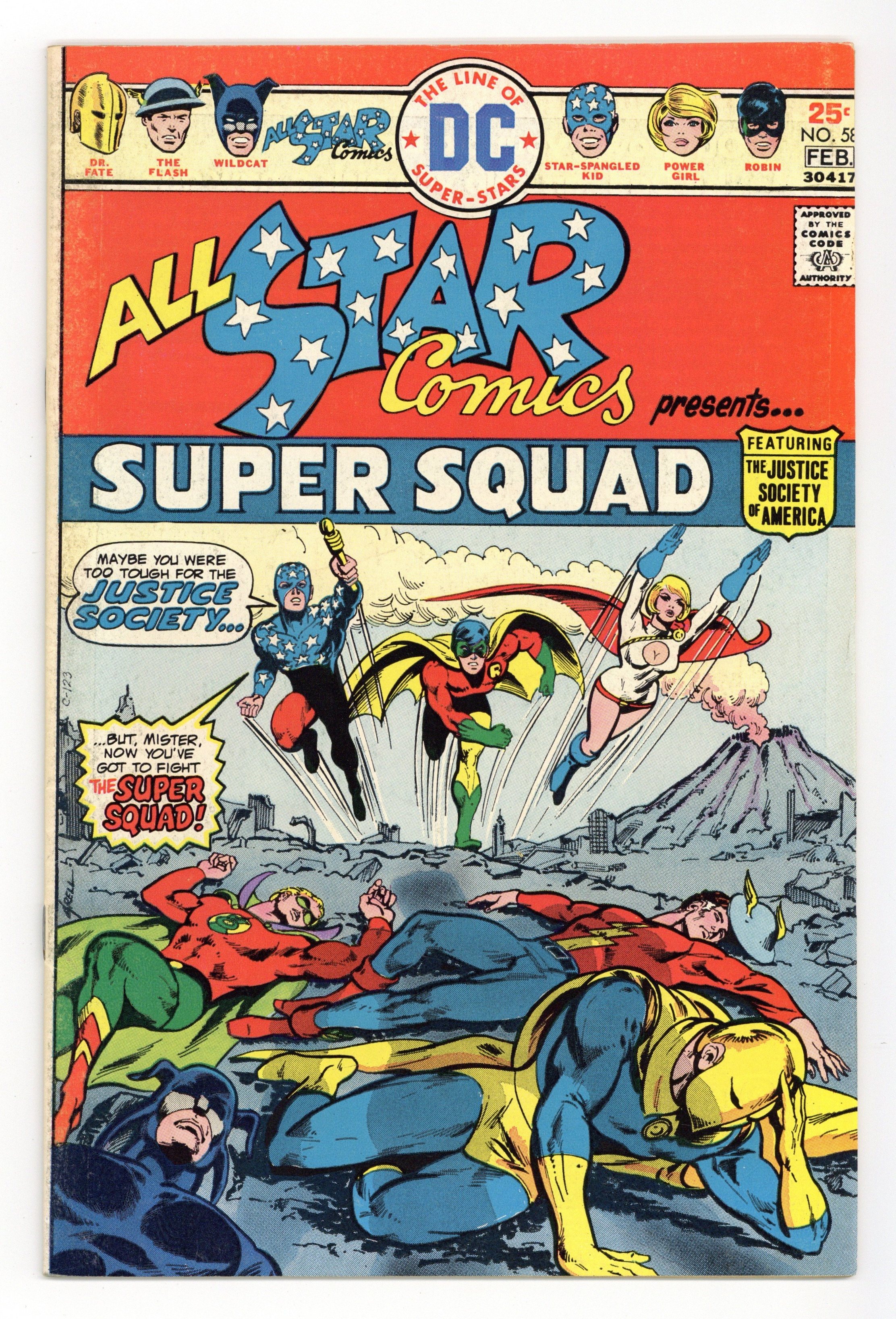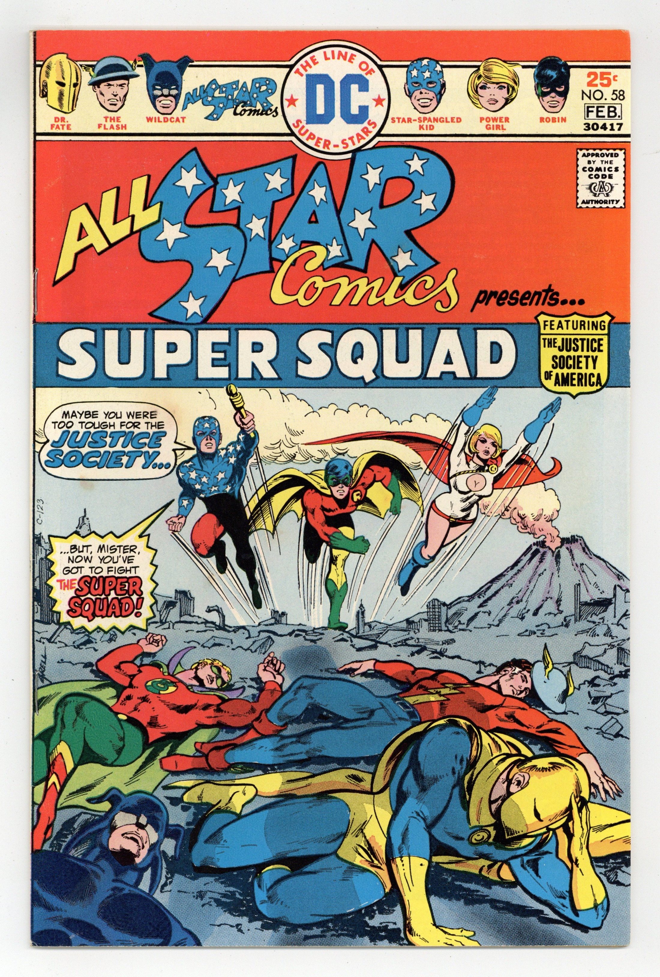 1st appearance of Power Girl. Cover art by Mike Grell. The Super Squad! starring the All Star Super Squad, script by Gerry Conway, pencils by Ric Estrada, inks by Wally Wood; Power Girl describes the Super Squad as a strike force composed of the JSA and the three younger heroes--Robin, Power Girl, and Star-Spangled Kid. Letters from Roy Thomas and Jerry Bails. The Captive Commissioner Hostess ad starring Batman, pencils by Curt Swan, inks by Vince Colletta. 36 Pages, Full Color. Cover price $0.25.
