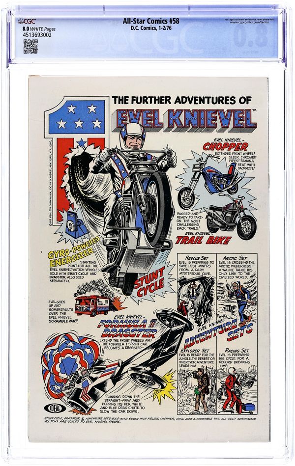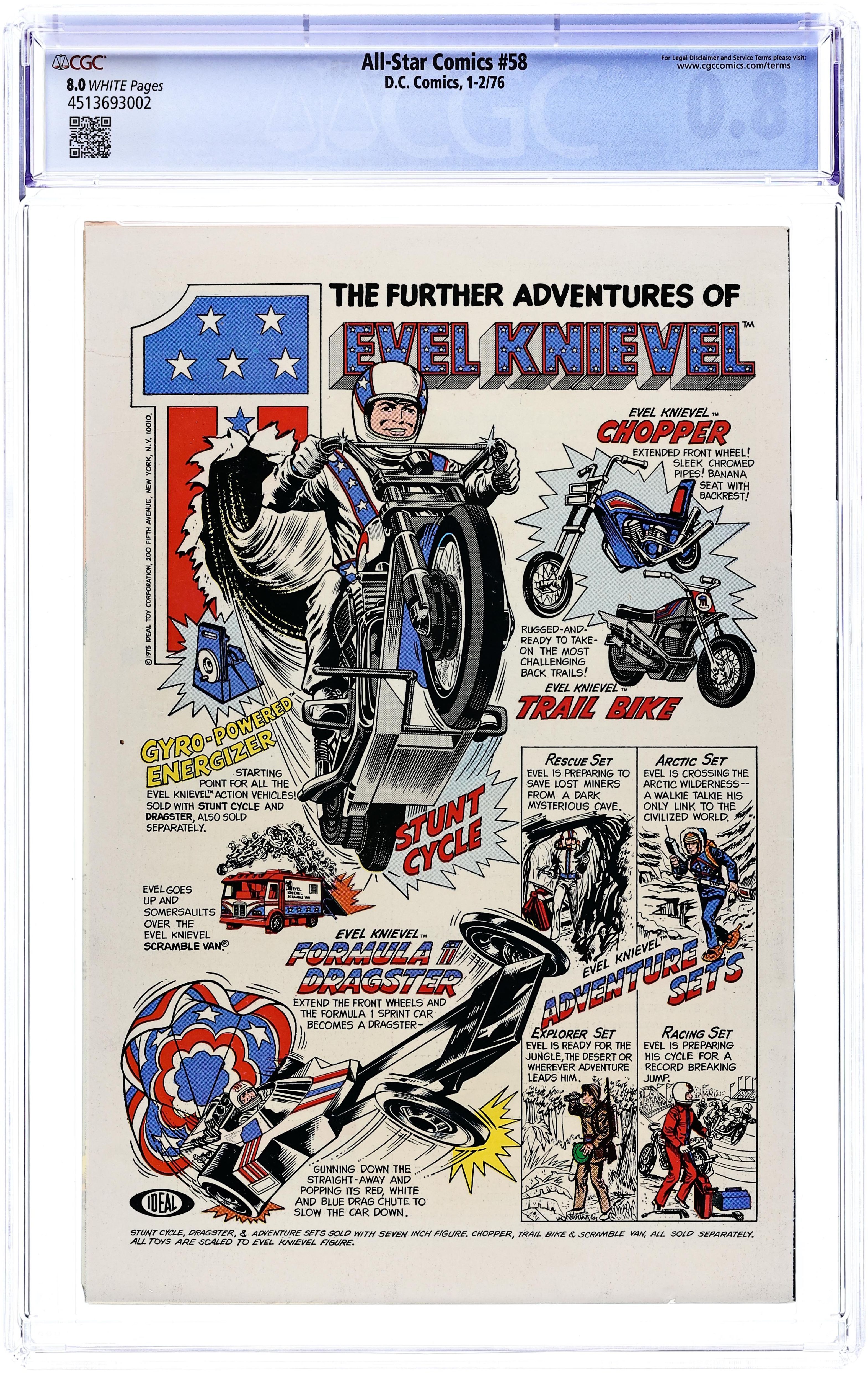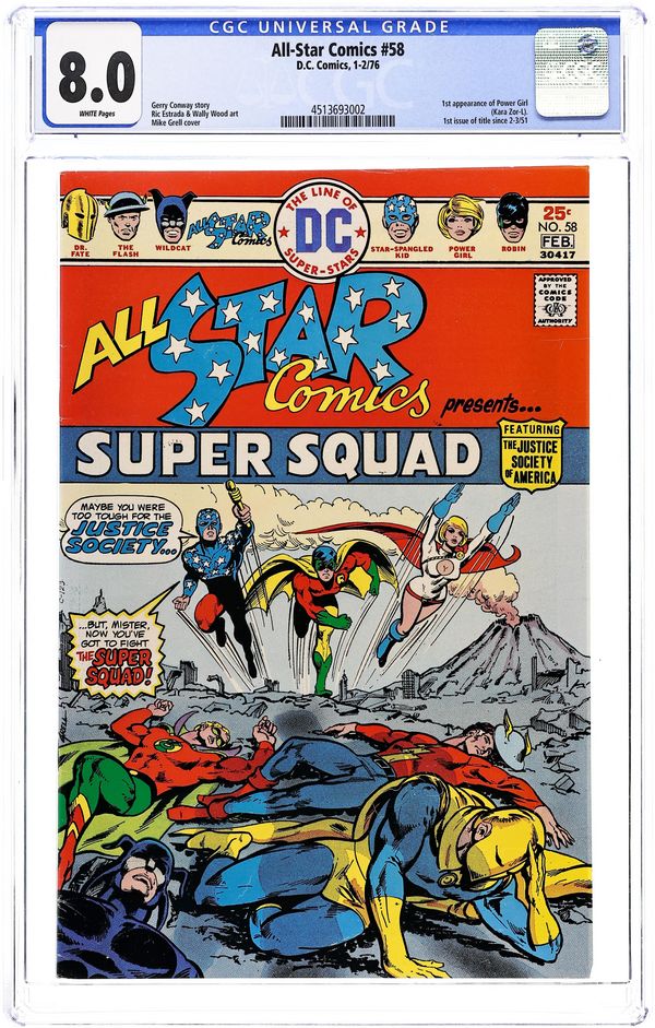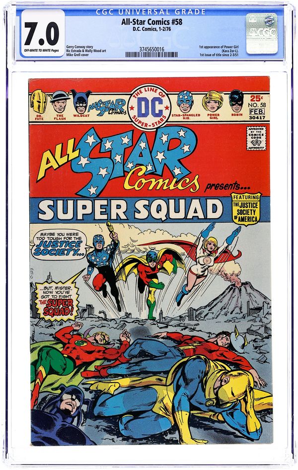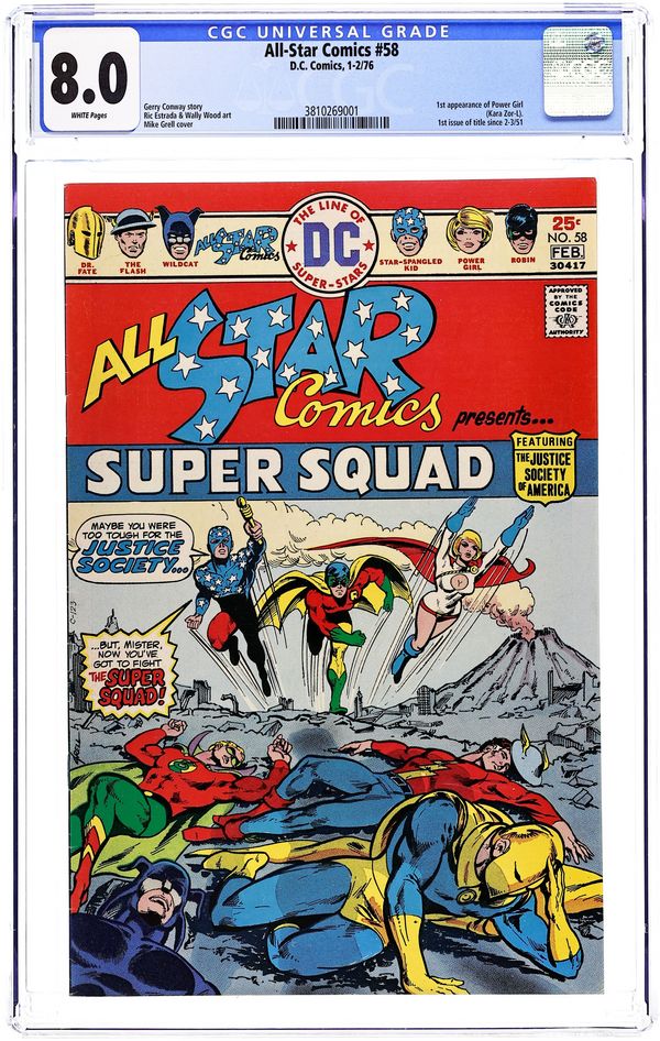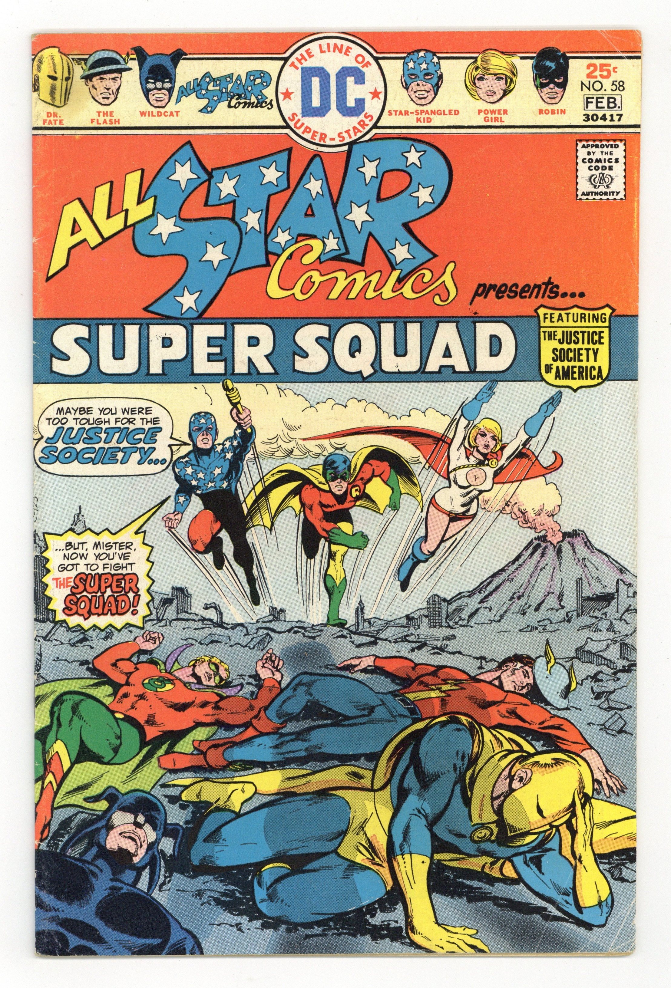 1st appearance of Power Girl. Cover art by Mike Grell. The Super Squad! starring the All Star Super Squad, script by Gerry Conway, pencils by Ric Estrada, inks by Wally Wood; Power Girl describes the Super Squad as a strike force composed of the JSA and the three younger heroes--Robin, Power Girl, and Star-Spangled Kid. Letters from Roy Thomas and Jerry Bails. The Captive Commissioner Hostess ad starring Batman, pencils by Curt Swan, inks by Vince Colletta. 36 Pages, Full Color. Cover price $0.25.