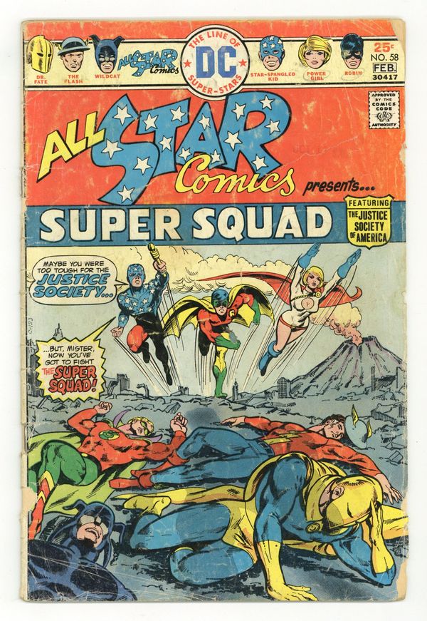 Tags: Justice League/Society$80.001st appearance of Power Girl. Cover art by Mike Grell. The Super Squad! starring the All Star Super Squad, script by Gerry Conway, pencils by Ric Estrada, inks by Wally Wood; Power Girl describes the Super Squad as a strike force composed of the JSA and the three younger heroes--Robin, Power Girl, and Star-Spangled Kid. Letters from Roy Thomas and Jerry Bails. The Captive Commissioner Hostess ad starring Batman, pencils by Curt Swan, inks by Vince Colletta. 36 Pages, Full Color. Cover price $0.25.