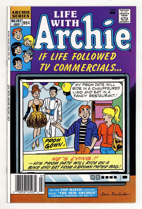 Published Jul 1988 by Archie Publications.$15.00Canadian Price Variant. 95¢ cover price. Cover art by Dan DeCarlo. "Health Education" art by Dan DeCarlo. "The Case of the Missing Dolls" script by George Gladir; Archie and Betty discover who has been stealing the dolls from a Suzy's doll exhibit. "Knowing U.S." activity page. "The Laffy Taffy Bunch" script by Rich Margopoulos; Veronica makes a bet with Archie that he can't keep from watching television for a whole week. "The First One Up!" script by Jim Ruth; The town of Riverdale sponsors a contest to name a preciously-unnamed hill. The Hill with be named for the winner of a race to its top. "Scare Tactics" script by Joe Edwards; Archie doesn't believe the hype about a scary movie. 36 pages, full color. Cover price $0.95.
