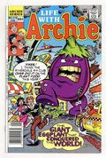 Published Jan 1989 by Archie Publications.$15.00Canadian Price Variant. 95¢ cover price. Cover pencils by Rex W. Lindsey. "The Giant Eggplant That Conquered the World," script by Rich Margopulos, pencils by Rex W. Lindsey, inks by Jon D'Agostino; Archie falls asleep and imagines himself in a B-movie. "Surprise Ending!" Sunkist ad with Archie and His Friends. "Dilton's Puzzle Pals!" activity page. "Follow the Sign" one-page story, script by Joe Edwards, pencils by Jeff Shultz, inks by Rudy Lapick; Mr. Lodge sees a lot of "Think Big" signs except when he's on his bathroom scale. Archie's Club News. "Candid Photos from the Riverdale High School Year Book," script by George Gladir, pencils by Jeff Shultz, inks by Rudy Lapick; featuring Archie Andrews, Waldo Weatherbee, Dilton Doiley, Jughead Jones, Geraldine Grundy, Moose Mason, Ethel Muggs, Professor Flutesnoot, Veronica Lodge, Reggie Mantle, Betty Cooper, Mr. Svenson, and Miss Beazley. "Ample Sample" one-page story; Archie asks for an ice cream sample. "Nightmares," script by George Gladir, pencils by Dan Parent, inks by Rudy Lapick; One panel each of the character's worst nightmare; Betty's nightmare is that Archie and Veronica get married. "There's a Bee in My Salad," script by Ken Pedersen, pencils by Doug Crane, inks by Jim DeCarlo; Archie and Jughead ruin Pop Tate's new salad bar. A Public Service Message from Archie Comics about AIDS awareness. "Cocoa Pebbles BMX Bike Race" cereal ad with The Flintstones. 36 pages, full color. Cover price $0.95.