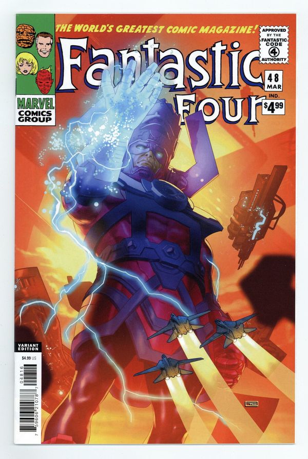 Tags: Fantastic Four, Reprint$18.00Limited 1 for 25 Retailer Incentive Variant Cover. Written by Stan Lee. Art by Jack Kirby. Cover by Taurin Clarke. The astonishing first chapter of the all-time-classic saga that fans call the Galactus Trilogy! Everything changes for the Fantastic Four - and the entire Marvel Universe - when they meet the enigmatic Silver Surfer, herald to the world-eating Galactus! The FF are still reeling from being caught between the Inhumans and Black Bolt's treacherous brother, Maximus the Mad, when the sky above New York City is seemingly engulfed in flame - and soon the Watcher arrives with a portent of doom. The Silver Surfer, wielder of the awesome Power Cosmic, is on his way to Earth as the advance scout for one of the most powerful entities in the universe. And when the being known as Galactus arrives, this world will be his next meal! It's one of the all-time great Marvel comic books, boldly re-presented in its original form, ads and all! Reprinting FANTASTIC FOUR (1961) #48. Marvel is reprinting the original Galactus trilogy as it originally appeared, over the next three months! 32 pages, full color. Cover price $4.99.