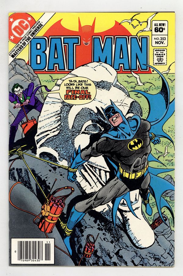 First Printing. Newsstand Edition. Cover art by Jose Luis Garcia-Lopez. "Last Laugh," script by Gerry Conway, pencils by Jose Luis Garcia-Lopez, inks by Dan Adkins; After getting Arthur Reeves to confess that Rupert Thorne gave him doctored photos of the Batman's "secret identity", Batman goes after the Joker, is captured, and finds himself tied to the side of a cliff in New Jersey set to explode in the shape of giant Joker-bust that the Clown Prince of Crime so dearly wants but is thwarted by the caped crusader. 15-page Masters of the Universe preview insert co-starring Superman: "Fate is the Killer" by Paul Kupperberg, Curt Swan & Dave Hunt. "The Sting--Batman Style," script by Mike Barr, pencils by Don Newton, inks by Dennis Jensen; Robin is conned into endorsing a phony fund drive for the Gotham Boys League; However, after the crooks rob the money from the Boys League headquarters, Robin decides to bring them in on his own; Batman helps by acting like a fellow con man. 52 Pages, Full Color. Cover price $0.60.