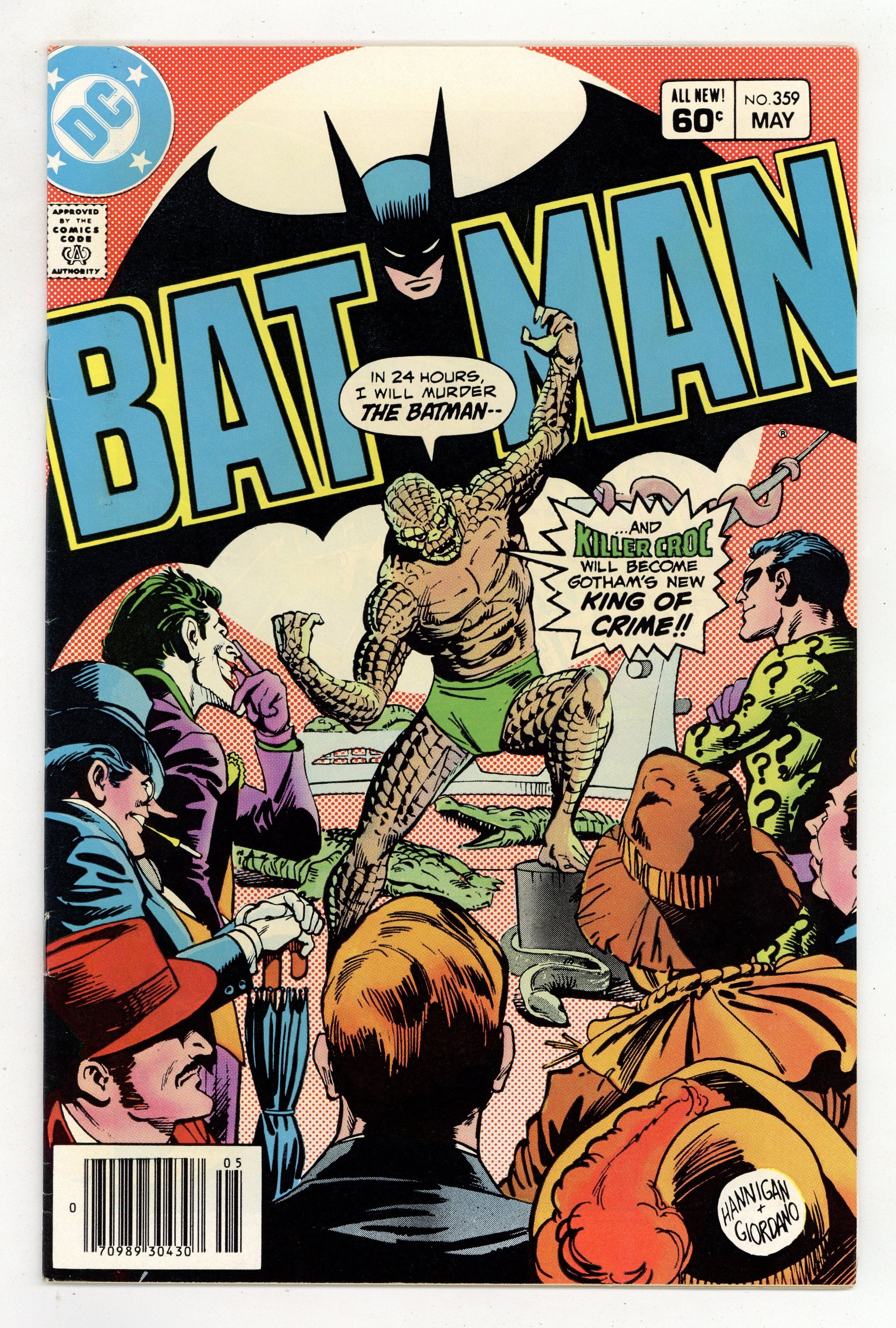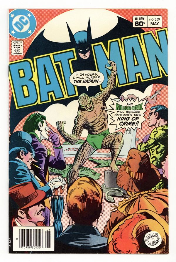 Tags: Batman$35.00Newsstand Edition. Cover pencils by Ed Hannigan, inks by Dick Giordano. Jason Todd becomes a continuing character in "Hunt" starring Batman, Dick Grayson, Jason Todd, James Gordon, Vicki Vale, Alfred Pennyworth, Waldo Flynn, Trina Todd, Joe Todd, and Killer Croc, script by Gerry Conway, pencils by Dan Jurgens, inks by Dick Giordano; Featuring the origin of Killer Croc!; Batman searches for the whereabouts of Killer Croc while Croc himself breaks into Gotham City Jail to take care of the last obstacle in his path toward ruling the Gotham Underground. 1st comic book work by Dan Jurgens. 36 Pages, Full Color. Cover price $0.60.