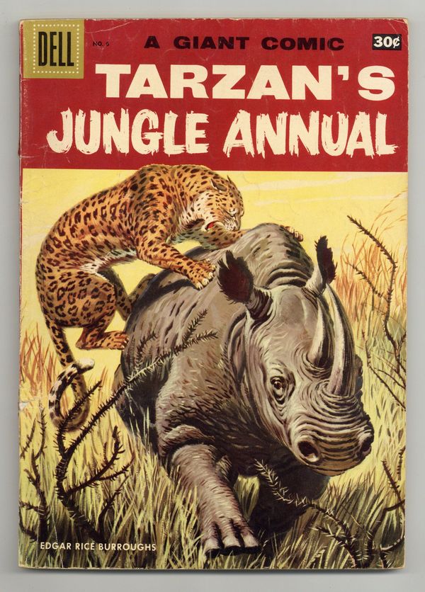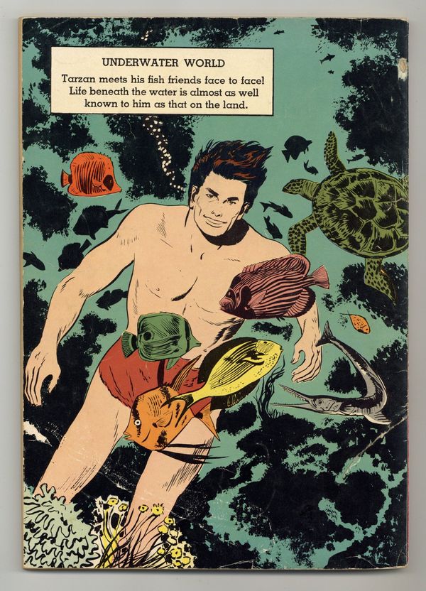 Canadian Price Variant. 30ยข cover price. Variant with Tarzan Underwater World back cover art. Painted cover art. Tarzan illustration by Jesse Marsh. "Tarzan and the Dwellers in the Depths," script by Gaylord Du Bois, art by Jesse Marsh; While traveling by dhow to Mombasa, Tarzan and his family are shipwrecked on an island by a storm. "Spotted Terror of African Skies" article. "Boy Meets the Golden Men," script by Gaylord Du Bois, art by Jesse Marsh; Boy and Dombie build a catamaran and get lost on the lake. "Jungle Carpenters" article. "Hottentot Melon Dance" article. "One of the Tribe," script by Gaylord Du Bois, art by Jesse Marsh; A young baboon is captured by farmers and escapes 5 years later and returns to his troupe of baboons. "River Animals of Tarzan's World" article. "Tarzan and the Treasure of Kings," script by Gaylord Du Bois, art by Jesse Marsh; Tarzan and Prince Rotan enter the Canyon on Night to find a king's treasure. "Jungle Taxi" article. "Boy and the Cassava Thief," script by Gaylord Du Bois, art by Russ Manning; Boy and Dombie trap a baby gorilla. "The Good Luck Gift," script by Gaylord Du Bois, art by Russ Manning; Jane helps Nimbo and Isha get married. "The Day the Sun Died," script by Gaylord Du Bois; Tarzan uses a solar eclipse to convince a tribe to quit the practice of head hunting. Tarzan's Ape-English Dictionary. Bolgani! Illustration, art by Jesse Marsh. Underwater World illustration on back cover Jesse Marsh. 100 Pages, Full Color. Cover price $0.30.