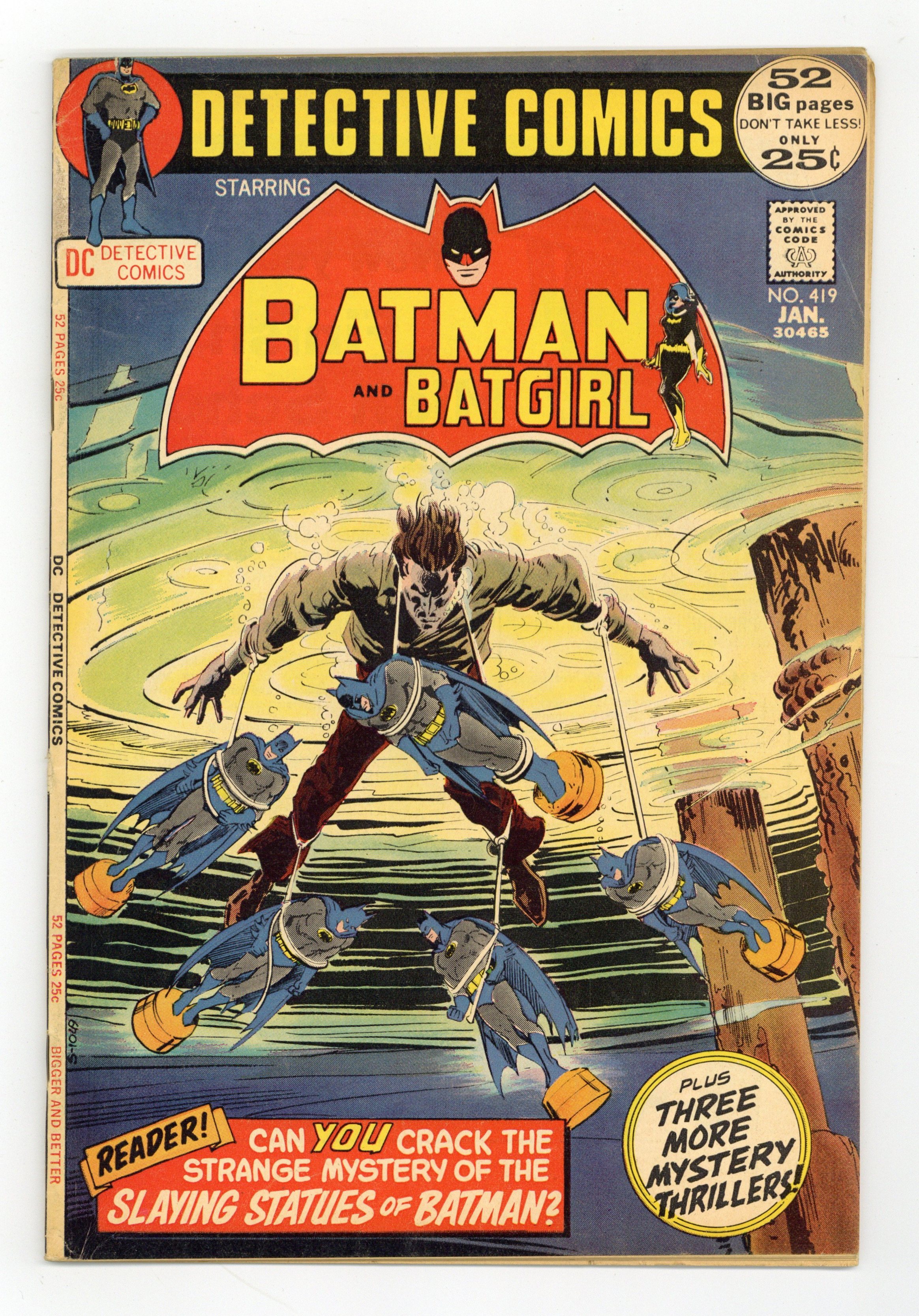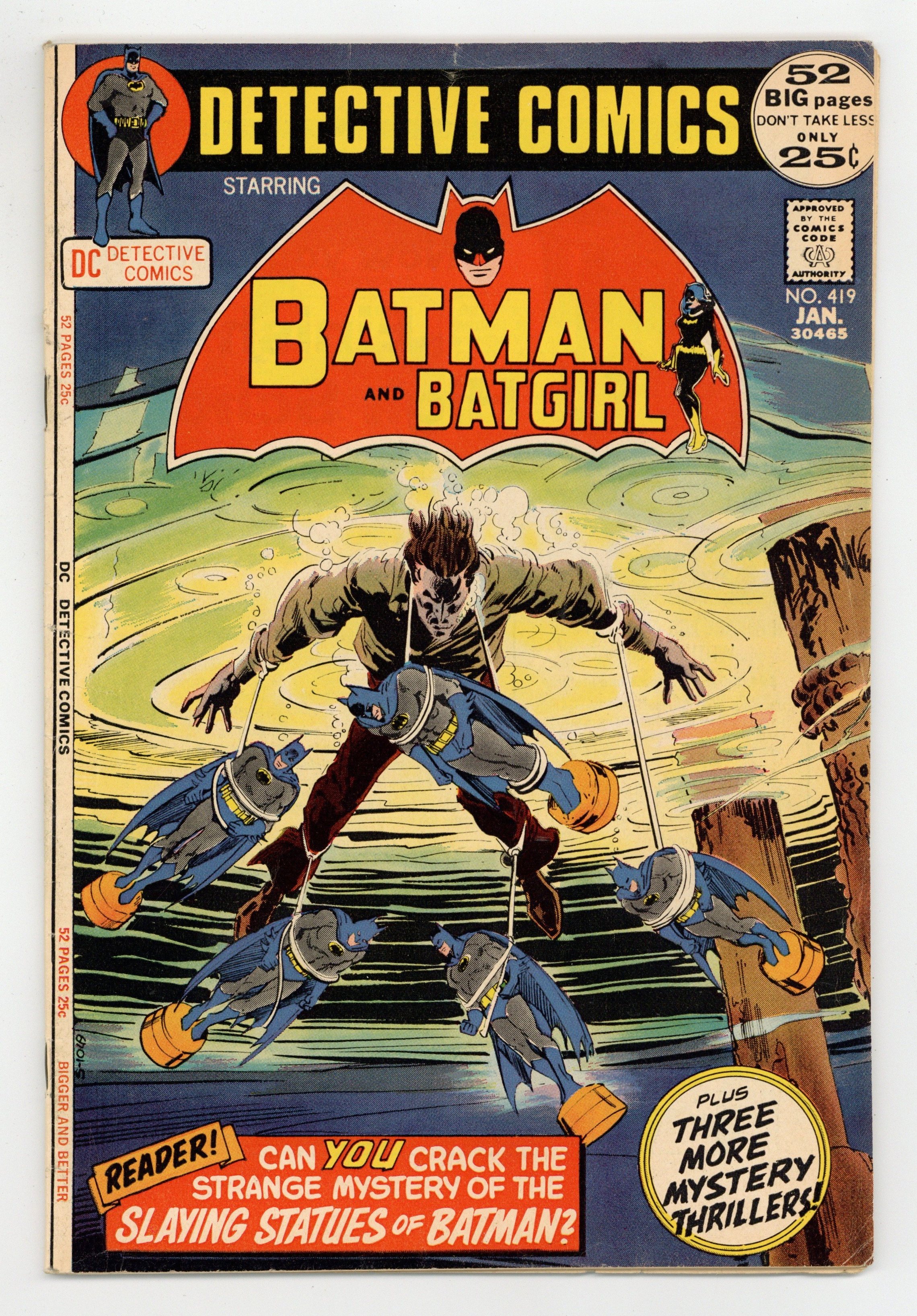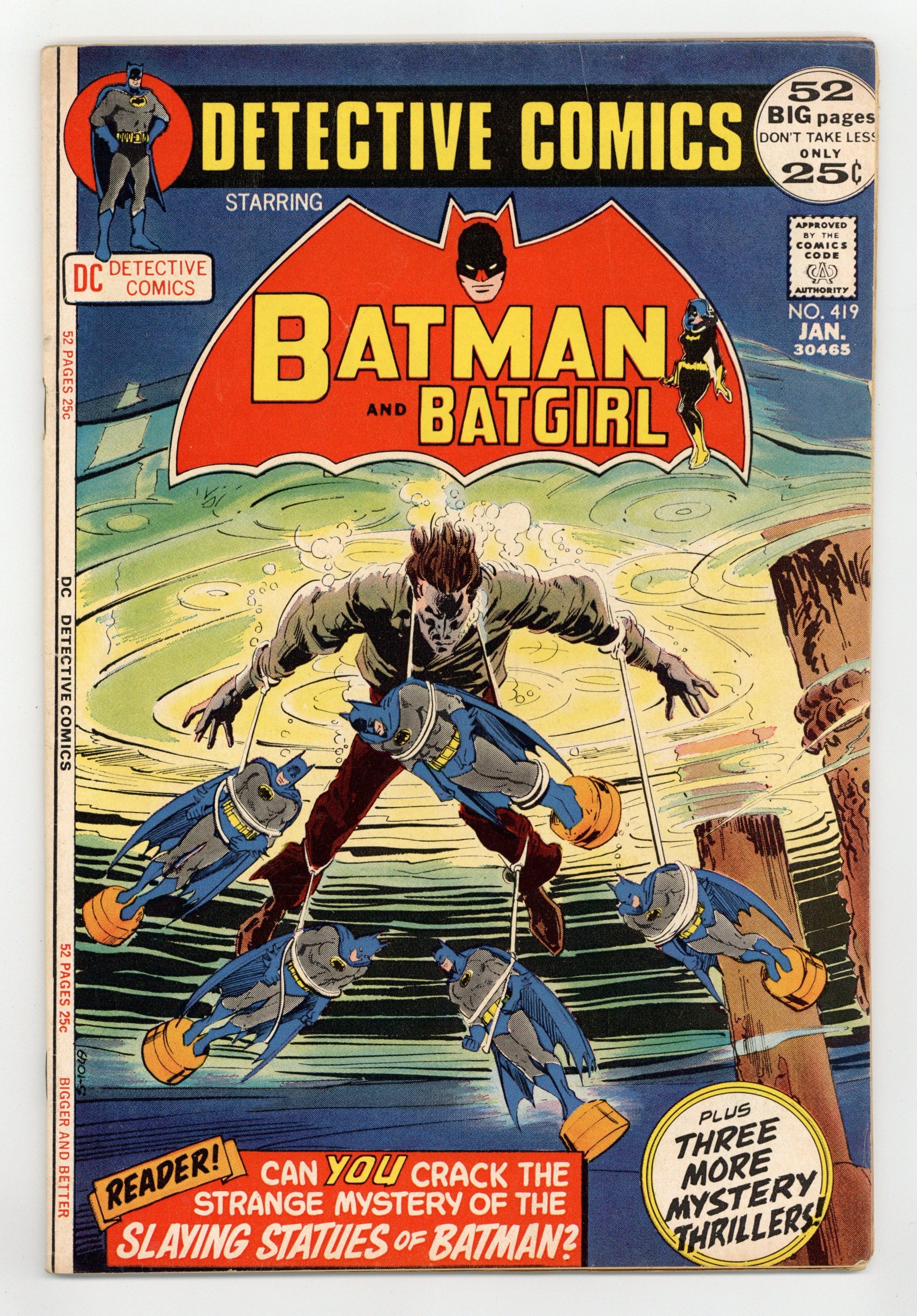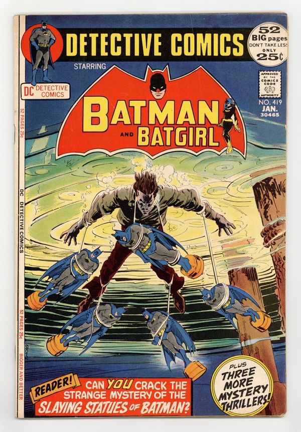 Starts Dec 8 52-page giant. Batman in "Secret of the Slaying Statues!" Script by Denny O'Neil, pencils by Irv Novick, inks by Dick Giordano. Batgirl back-up story, "Long Live the Kingpin!" Script by Frank Robbins, art by Don Heck. Reprints: Roy Raymond, TV Detective in "The Return of Ben Franklin" (art by Ruben Moreira; from Detective # 213) and "The Human Target" (from Gangbusters # 61). Letters to the editor from comics writers Mike Barr and Bob Rozakis. Neal Adams cover. 52 pgs. Cover price $0.25.