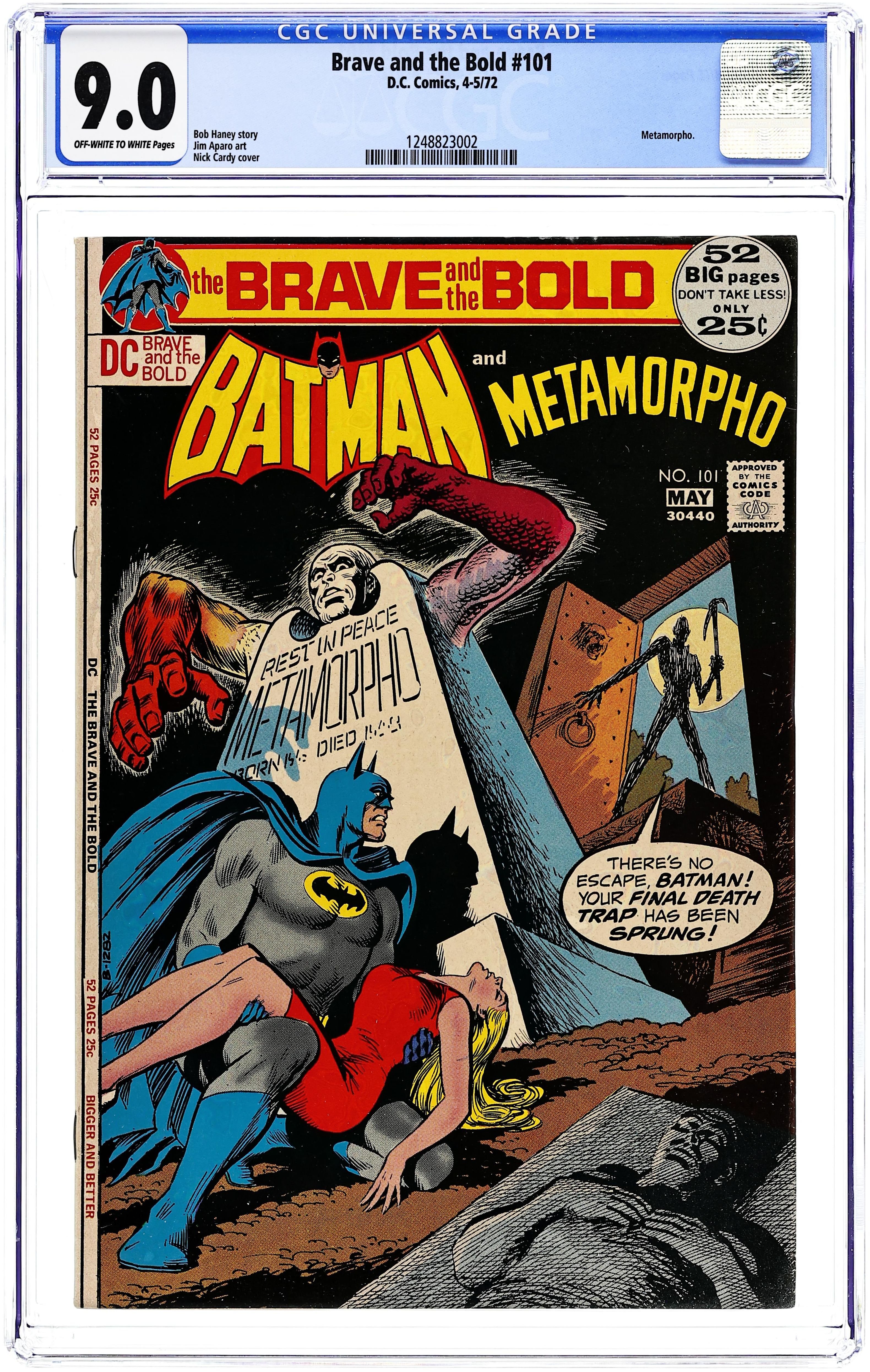 Giant-size issue. Cover by Nick Cardy. "Cold Blood, Hot Gun!", script by Bob Haney, art by Jim Aparo; The Bounty Hunter has been hired to kill six wealthy people who are bidding to get ownership of the Fairbarin Estate; This brings the attention of Batman, and Metamorpho, who is revived early in order to protect Sapphire Stagg, who is also on the list; The ordeal lasts until the night when the bidding on the estate begins; It's soon realized that the man who hired the Bounty Hunter is Derwent Fairbarin. Reprint story from Brave and the Bold #19: "The Challenge of the Flying Horse," script by Bob Haney, art by Joe Kubert; To complete his latest task, Jon climbs a mountain where a great sea eagle has its perch, his goal to collect a single feather from it's wing. A dark figure swoops out of the clouds and attacks him, not an eagle, but a winged horse. It carries Jon to Valhalla, a land in the clouds ruled by warrior women. Letter to the editor from comic editor Bob Rozakis. Statement of ownership - average print run 379,166; average paid circulation 210,708. 52 Pages, Full Color. Cover price $0.25.