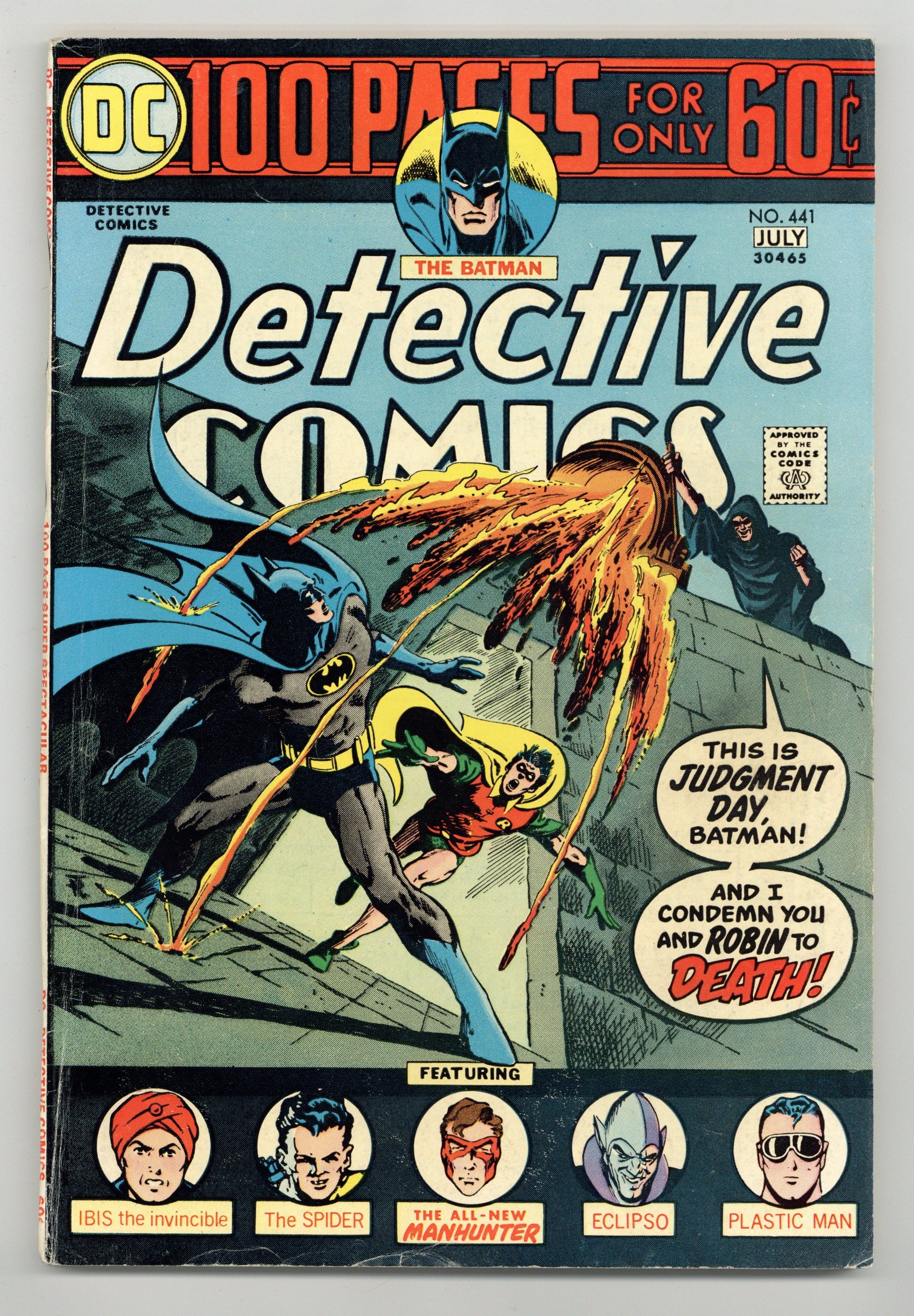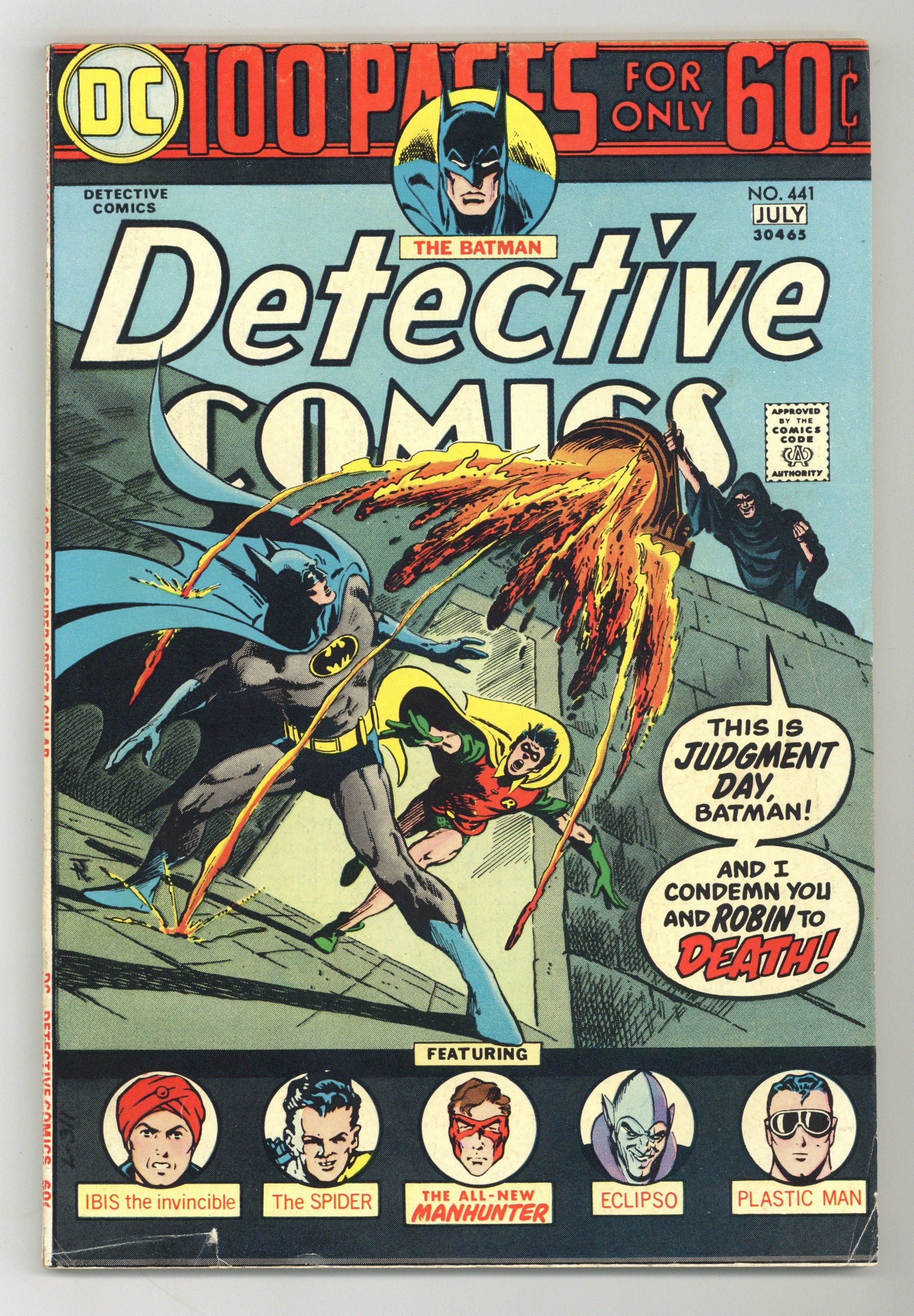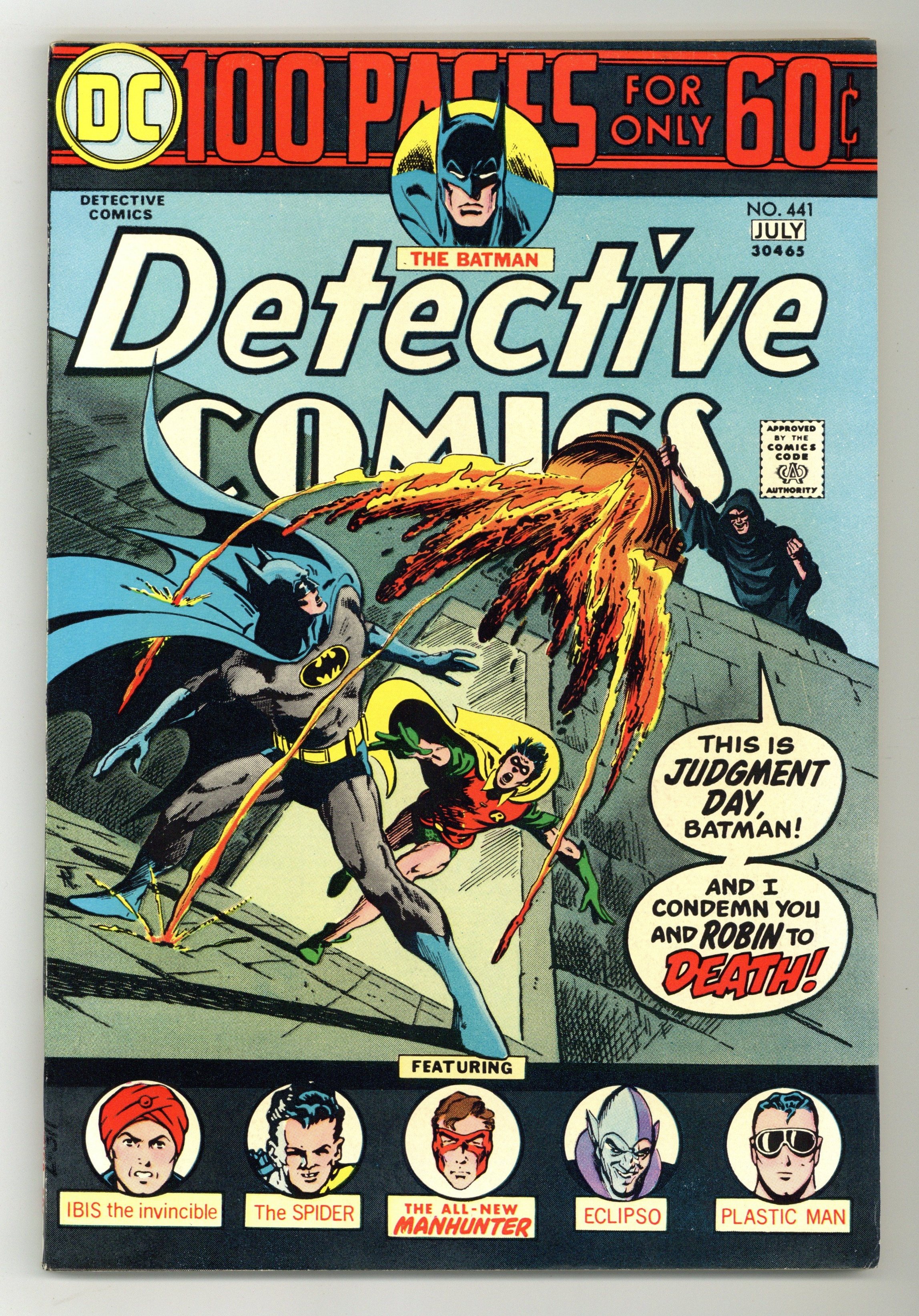 Cover by Jim Aparo. New Batman story, "Judgement Day!" (script by Archie Goodwin, art by Howard Chaykin). New Manhunter story, "Cathedral Perilous" (chapter 5; script by Archie Goodwin, art by Walt Simonson). 1945 Plastic Man untitled reprint. Two 1940's Batman reprints, "The Case of the Prophetic Pictures" (from Detective 42) and "The Carbon Copy Crimes!" (from Batman 38). Ibis the Invincible Golden Age reprint, "Holocause, God of Destruction!" (from Whiz 95; art by Kurt Schaffenberger). Eclipso reprint, "The Two Faces of Doom" (from House of Secrets 66; art by Alex Toth). Alias the Spider 1942 untitled reprint (from Crack Comics 25; art by Paul Gustavson). Sal Amendola contents page illustration. 100 pgs. Cover price $0.60.