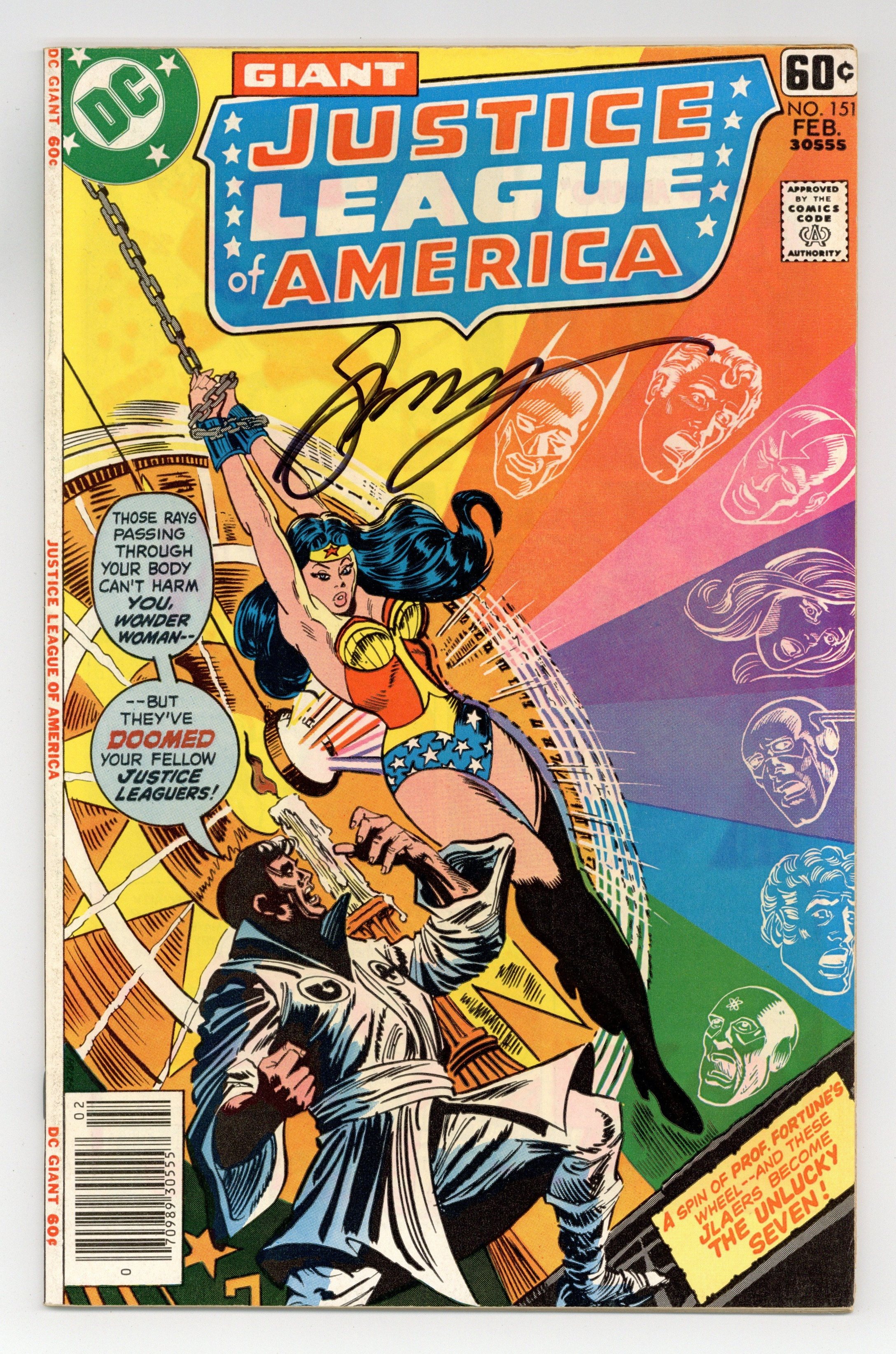 "The Unluckiest League of All!" Written by Gerry Conway, with art by Dick Dillin and Frank McLaughlin. Characters: Wonder Woman [Earth-1]; Hawkwoman [Shayera Thal] (as Hawkgirl); Black Canary; Elongated Man; Flash [Barry Allen]; Green Lantern [Hal Jordan]; Green Arrow [Earth-1]; Aquaman; Atom [Ray Palmer]; Superman [Earth-1]; Batman [Earth-1]; Red Tornado; Hawkman [Katar Hol] (all as the Justice League of America/JLA); The Racer; Strongman; The Crier; The Acrobat; Cyclone; The Shrinking Man; Water King; Jean Loring (flashback); Power Girl (flashback); Professor Amos Fortune (villain); Captain Comet (flashback). Cover by Al Milgrom and Joe Orlando. Cover price $0.60.