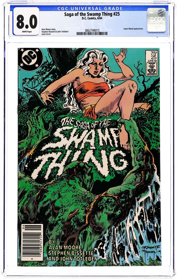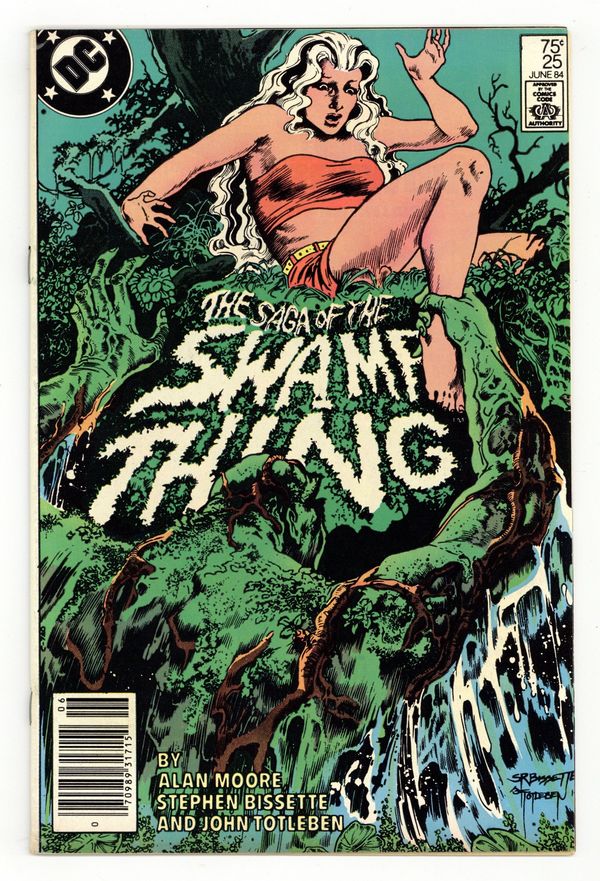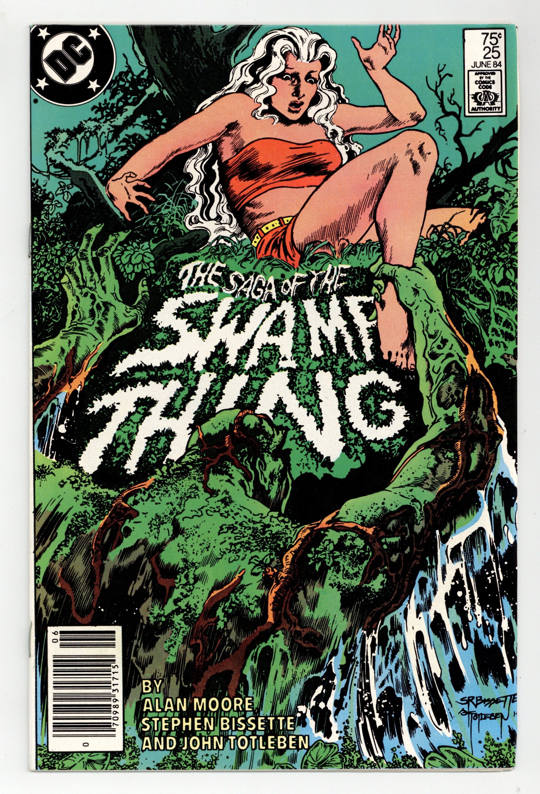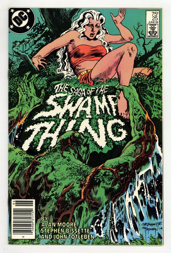 Newsstand Edition. Cover by Stephen R. Bissette and John Totleben. The Sleep of Reason..., script by Alan Moore, art by Stephen R. Bissette and John Totleben; Using a Ouija board, Chris and Jenny (Pauls parents) release the Monkey King, who adopts Paul as his master; Jason The Demon Blood goes to Baton Rouge; Abby gets a new job at Elysium Lawns; The Monkey King, getting stronger, is ready to attack again; John Constantine cameo. NOTE: See Swamp Thing (1982 2nd Series) #37 for Constantine's first full appearance. Part 1 of 3. 36 pgs., full color. $0.75. Cover price $0.75.