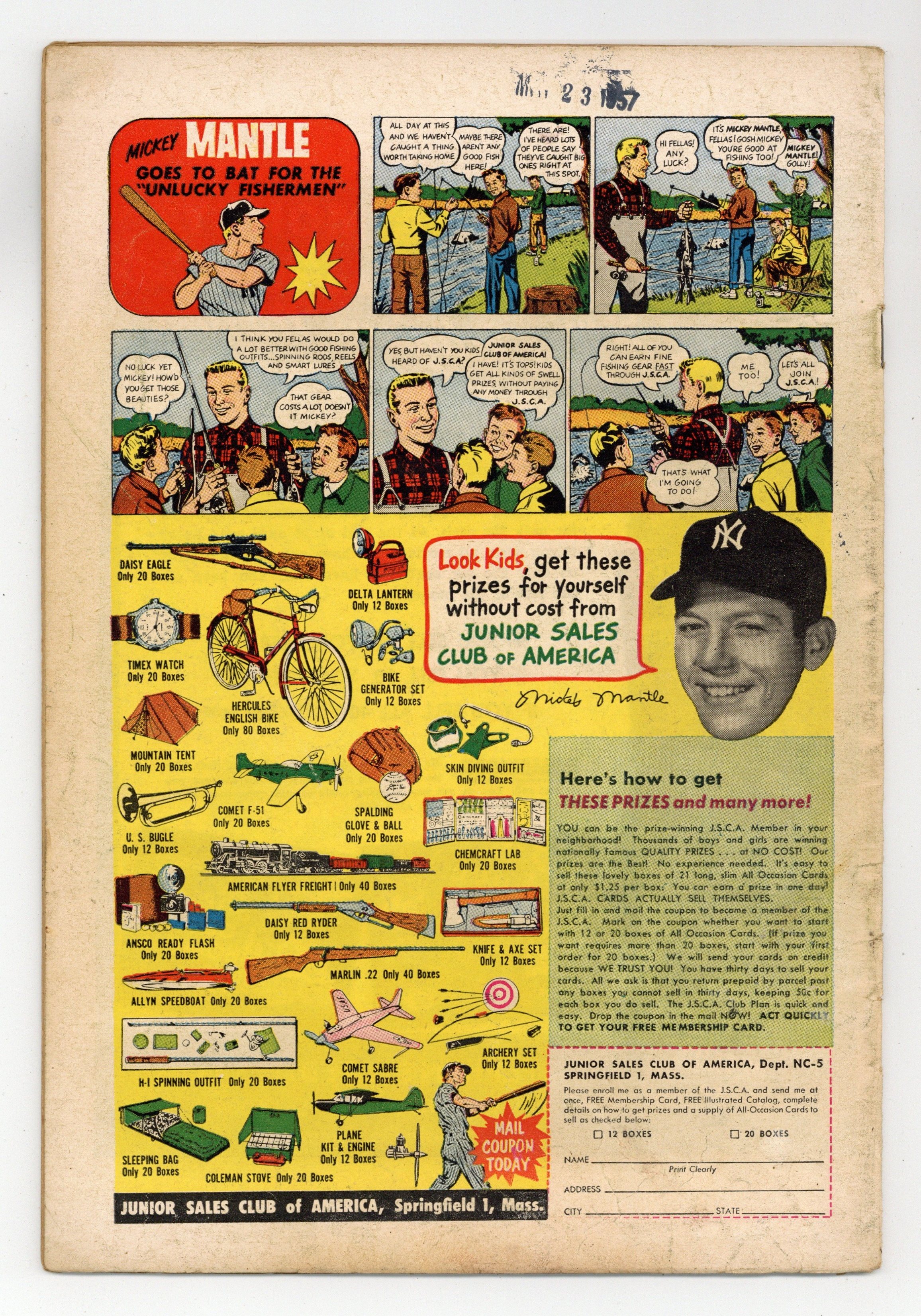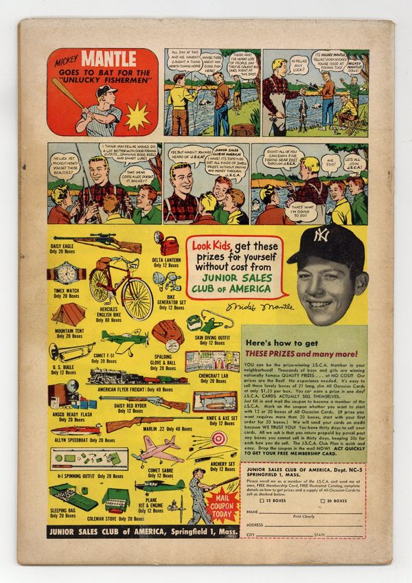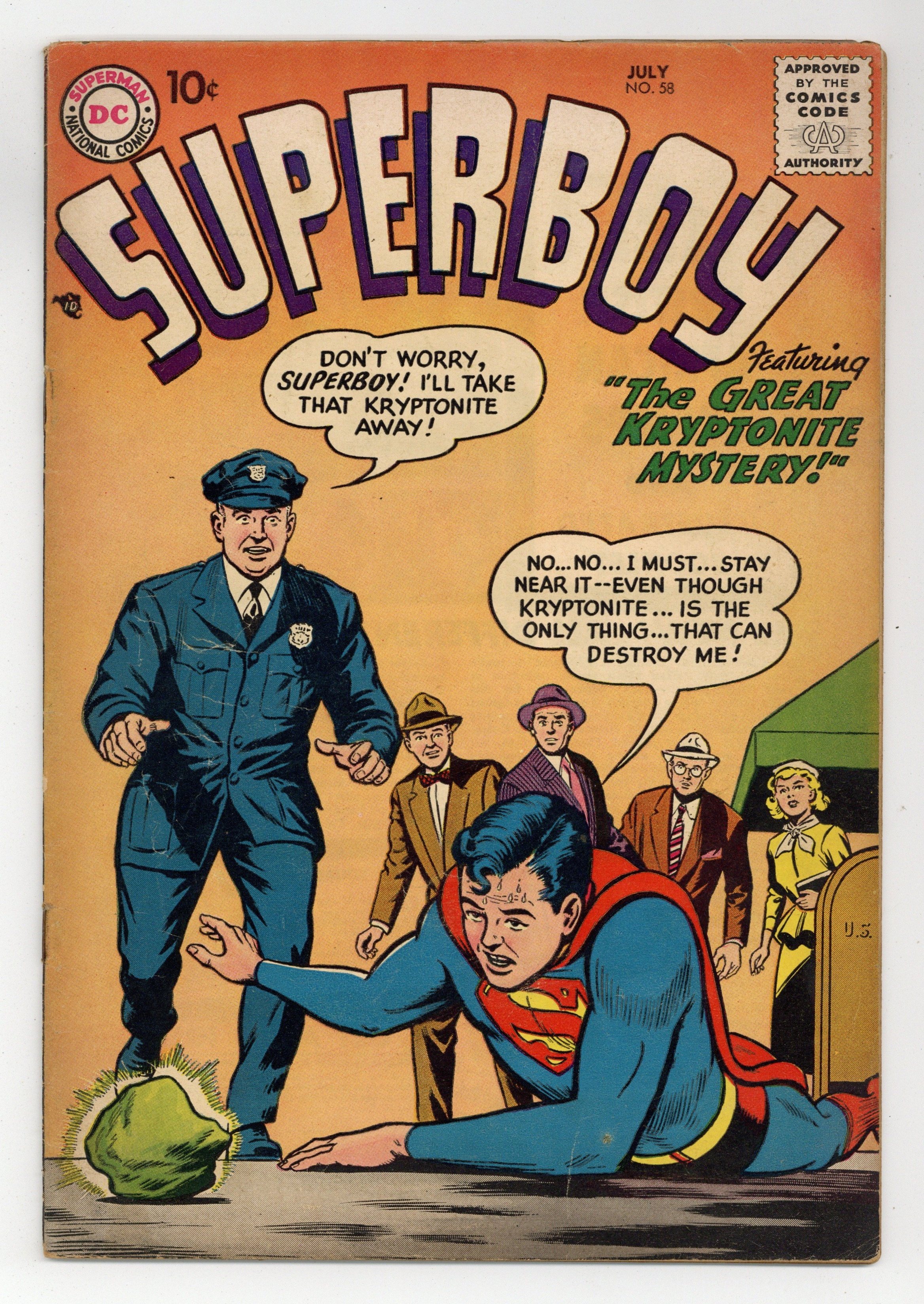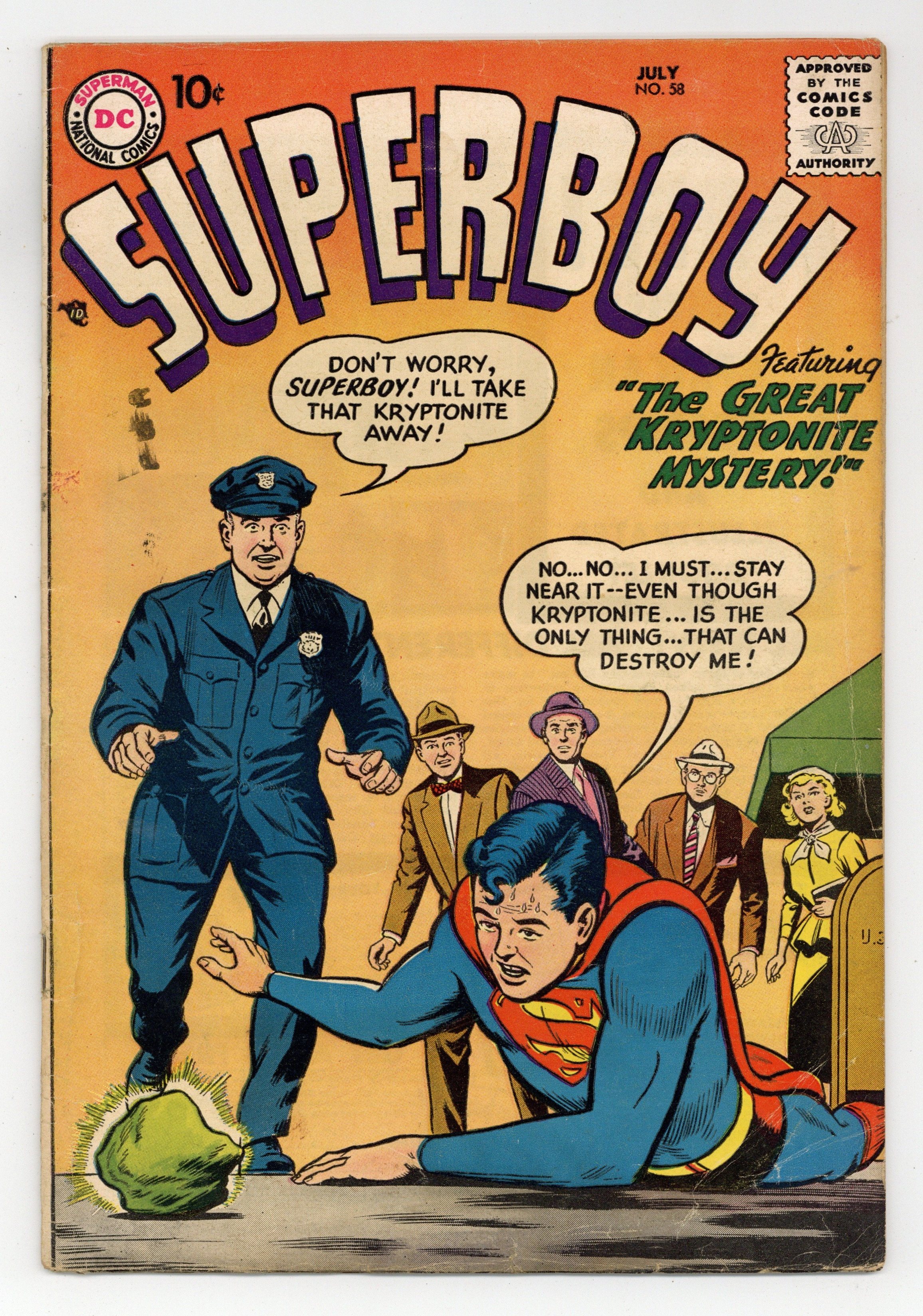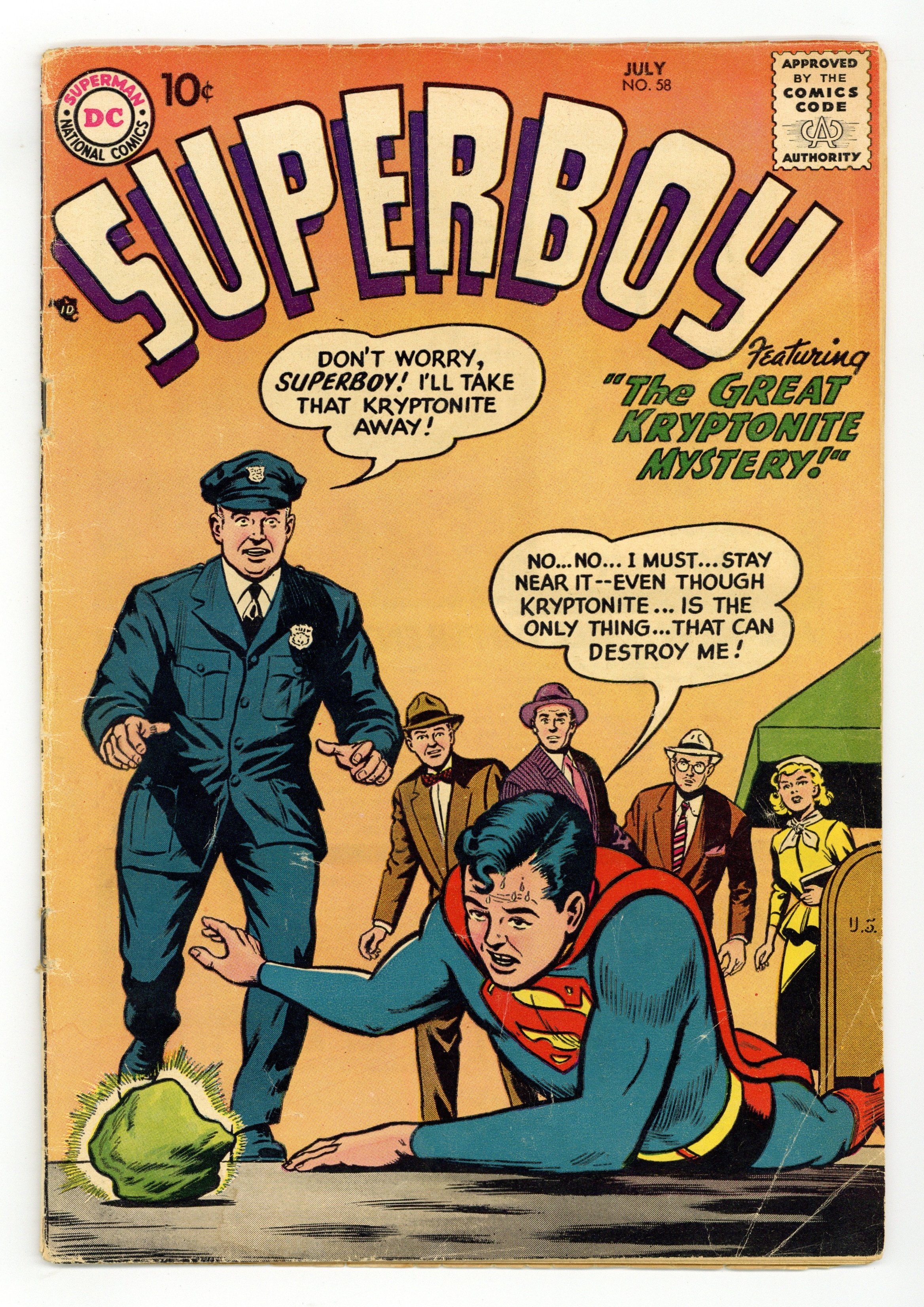Cover pencils by Curt Swan, inks by Ray Burnley. The 100 New Feats of Superboy starring Martha Kent and Jonathan Kent, script by Otto Binder, art by John Sikela. Binky Shows "How to Make New Friends!" public service announcement starring Binky, script by Jack Schiff, art by Bob Oksner. Superboy's New Secret Identity, script by Otto Binder, art by John Sikela; Superboy moves into Lana's house and pretends to be her cousin Tommy in order to prove she can't keep a secret. Comics "Television" Viewer--Superboy's Workshop activity page. Five Famous Magic Tricks text article. The Great Kryptonite Mystery, script by Jerry Coleman, pencils by Curt Swan, inks by Ray Burnley; Superboy attempts to "vaccinate" himself against Kryptonite. Shorty humor two-pager by Henry Boltinoff. 36 Pages, Full Color. Cover price $0.10.