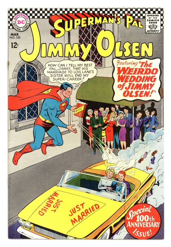 Cover pencils by Curt Swan, inks by George Klein. Jimmy Olsen's Weirdo Wedding!, script by Leo Dorfman, art by Pete Costanza; Jimmy and Lucy actually marry; When Jimmy's old flames keep turning up to make things uncomfortable, the not so happy couple decide to annul the wedding. Countdown on Excellence public service announcement, script by Jack Schiff, art by Sheldon Moldoff. Cap's Hobby Hints by Henry Boltinoff. Statement of ownership--average print run 786,000; average paid circulation 523,455. 36 Pages, Full Color. Cover price $0.12.