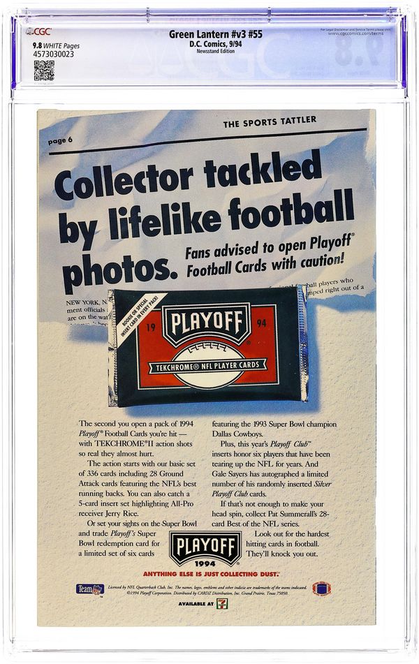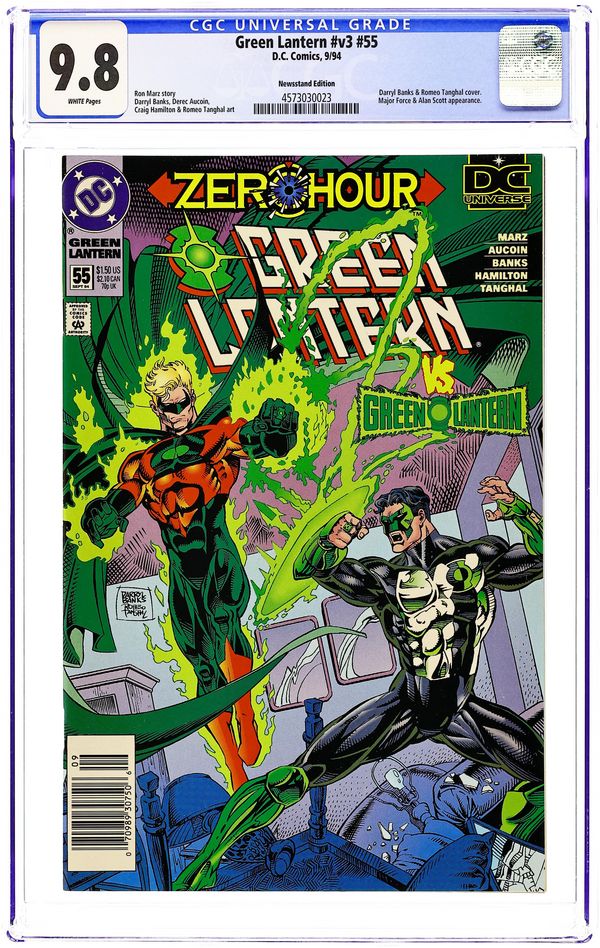 Newsstand Edition. Zero Hour tie-in. "Assault & Battery!" Part 2 of 2. Guest-starring Green Lantern (Alan Scott). Superman cameo. Story by Ron Marz. Art by Craig Hamilton, Derec Aucoin, Darryl Banks, and Romeo Tanghal. With his power gone, how will Kyle survive his confrontation with the ruthless Major Force, the man who murdered his girlfriend? Plus, the new Green Lantern meets the first man to bear his mantle - Alan Scott! Story continued in Zero Hour: Crisis in Time (1994) #4. Cover price $1.50.