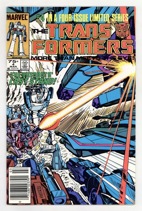 First Printing. Newsstand Edition. Part 4 of 4. Story by Jim Salicrup. Art by Frank Springer, Ian Akin and Brian Garvey. Cover by Mark Texeira. It's the Autobots' last stand. Low on fuel and out matched, these benevolent Transformers fall before their oppressor rivals, the vile Decepticons. This story's end proves one thing...the good guys don't always win. This is a first printing. All 2nd or 3rd printings have a 2nd, 3rd printing notice on inside at bottom of indicia on first/splash page. 2nd printings were done for most issues from #1 to #9. Cover price $0.75.
