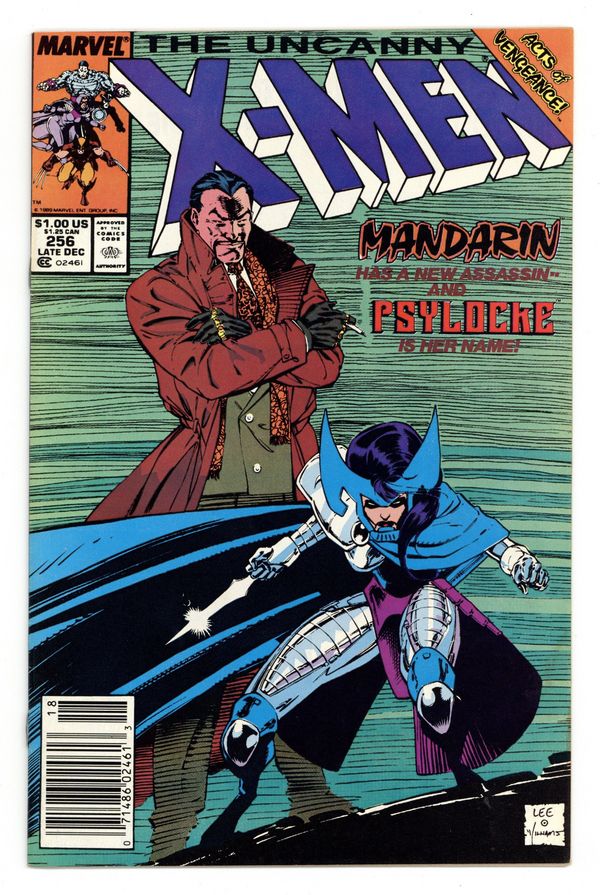 Newsstand Edition. Acts of Vengeance: Part 1 of 3. "The Key that Breaks the Locke!" Story by Chris Claremont. Art and cover by Jim Lee and Scott Williams. A cabal made-up of some of Marvel's most dangerous villains has gathered together to pull their resources and finally destroy the heroes who oppose them. This inner circle consists of Doctor Doom, Magneto, the Kingpin, Wizard, Red Skull, the Mandarin, and a mysterious benefactor. Their plan is to surprise their enemies with foes whom they've never faced. In this issue, Iron Man's arch nemesis the Mandarin takes on a new apprentice - Lady Mandarin! The X-Men know her as Psylocke. NOTE: 1st appearance of the ninja Psylocke. 36 pgs. Cover price $1.00.