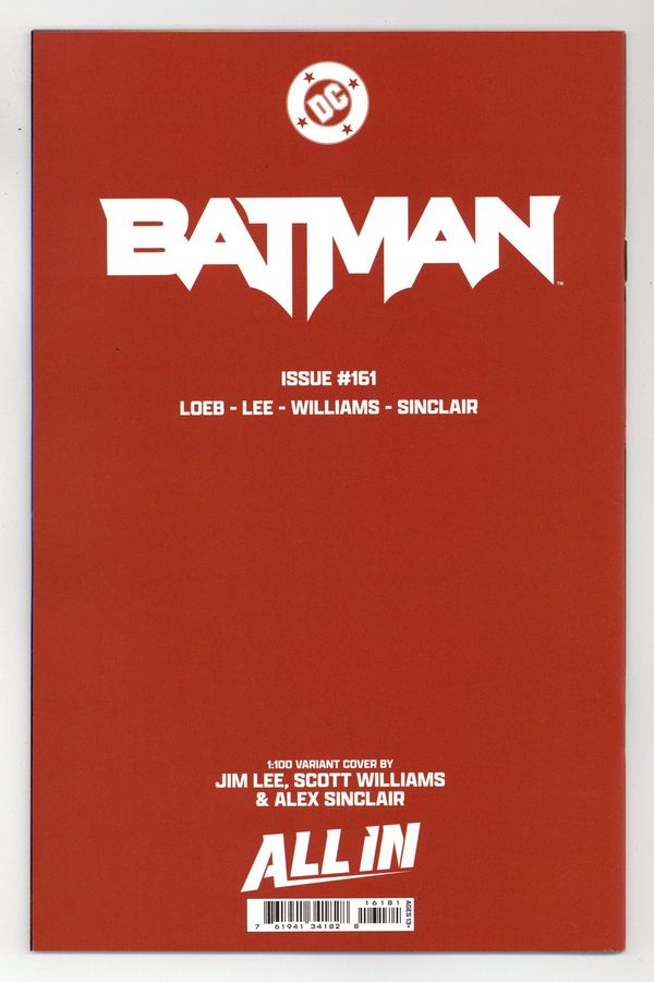 $41.00Limited 1 for 100 Retailer Incentive Variant Cover. Written by Jeph Loeb. Art by Jim Lee, Scott Williams. Cover by Jim Lee, Scott Williams. H2SH WITH JEPH LOEB AND JIM LEE PART 4! Batman's battle with Hush takes a dark turn when Damian (Robin) and Bane team up! 40 pages, full color. Rated T+ Cover price $5.99.