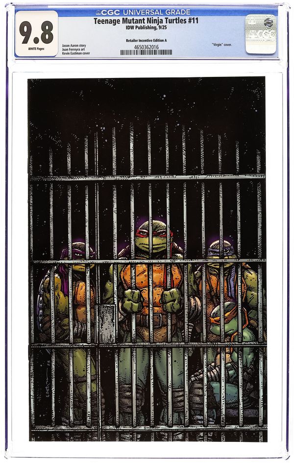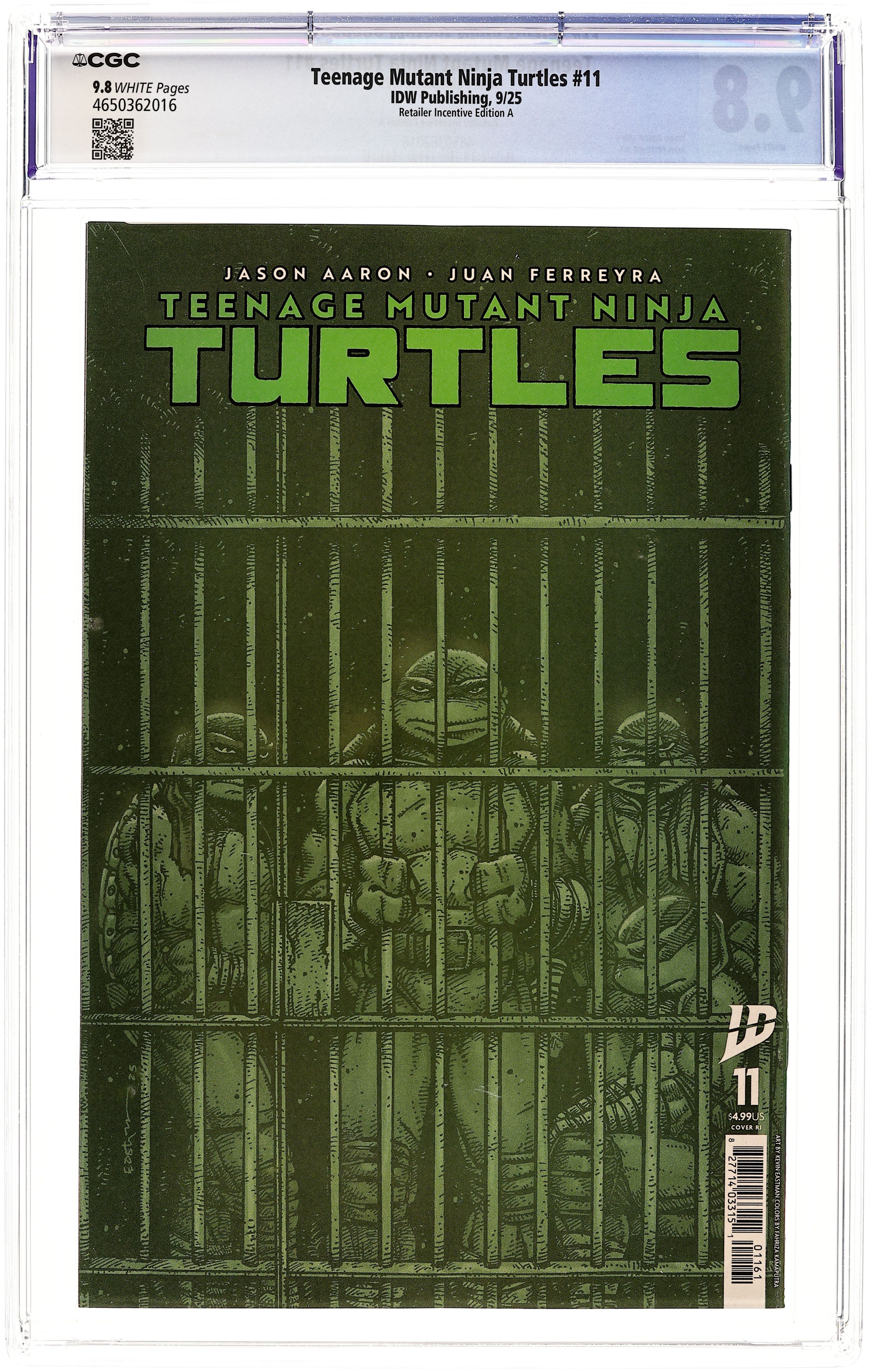 Limited 1 for 10 Retailer Incentive Variant Cover. Written by Jason Aaron. Art by Juan Ferreyra. Cover by Kevin Eastman. With the Ninja Turtles on trial for a murder they didnt commit, Casey Jones fighting for his life in a devastating coma, and the city overrun by Foot Patrol thugs, New York has but one hope to turn the tide: April ONeil? 28 pages, full color. Cover price $4.99.