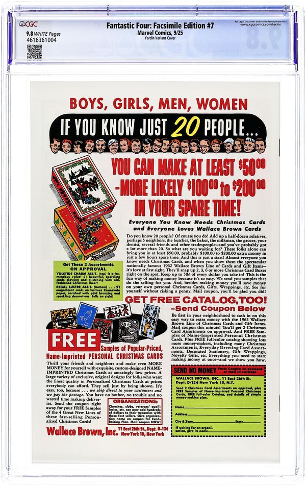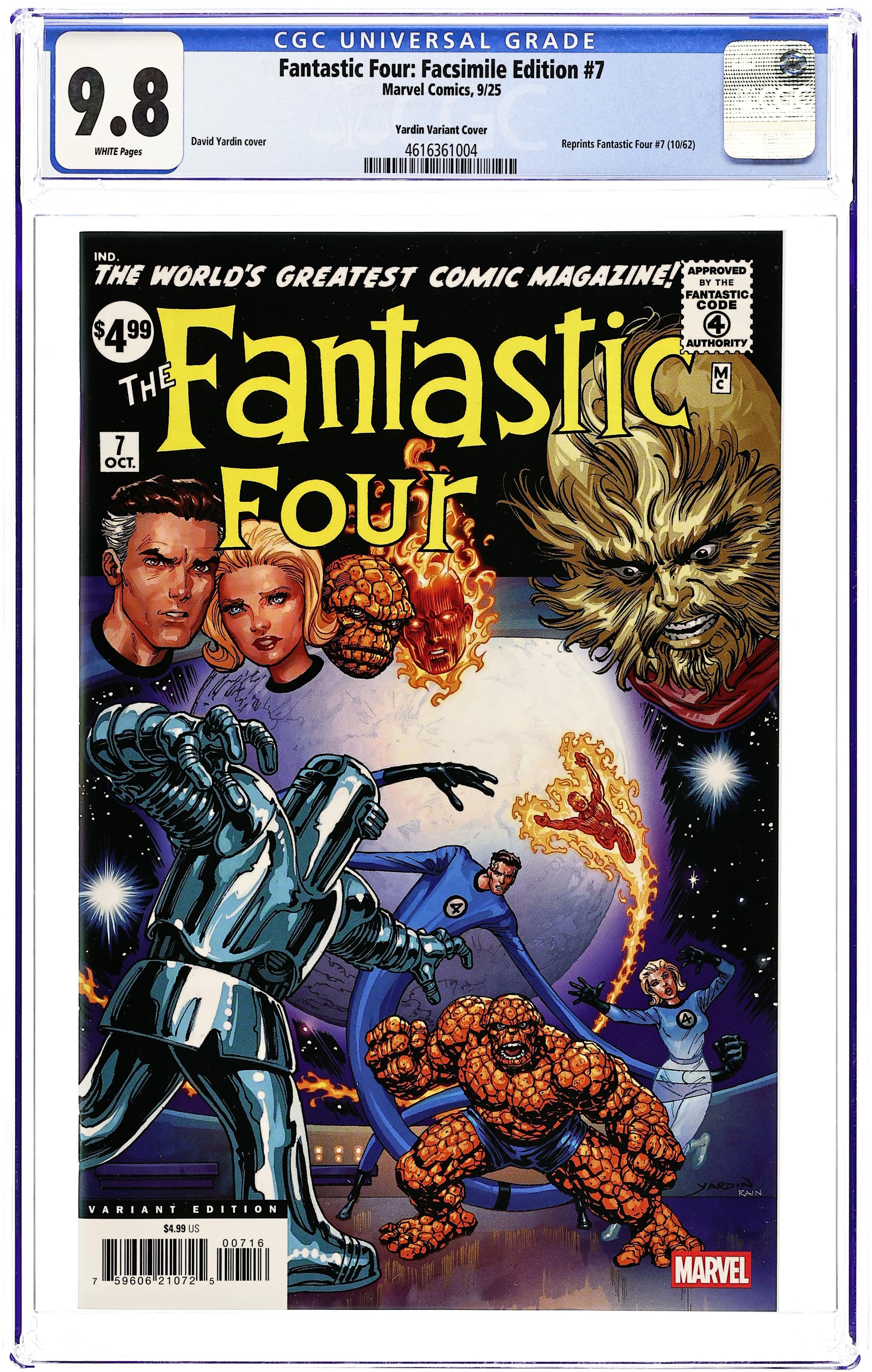 Limited 1 for 25 Retailer Incentive Variant Cover. Written by Stan Lee. Art by Jack Kirby. Cover by David Yardin. The Fantastic Four are invited to attend a fancy dinner in their honor - but the celebrations don't last long! Because suddenly, everyone in attendance turns against them — branding them as public menaces! What is going on? And what does it have to do with Kurrgo, Master of Planet X? Our heroes will have to journey across the cosmos for answers - and to face their greatest challenge yet! It's one of the all-time great Marvel comic books, boldly re-presented in its original form, ads and all! Reprinting FANTASTIC FOUR (1961) #7. Marvel is reprinting the first twelve issues of FANTASTIC FOUR as they originally appeared! 32 pages, full color. Cover price $4.99.