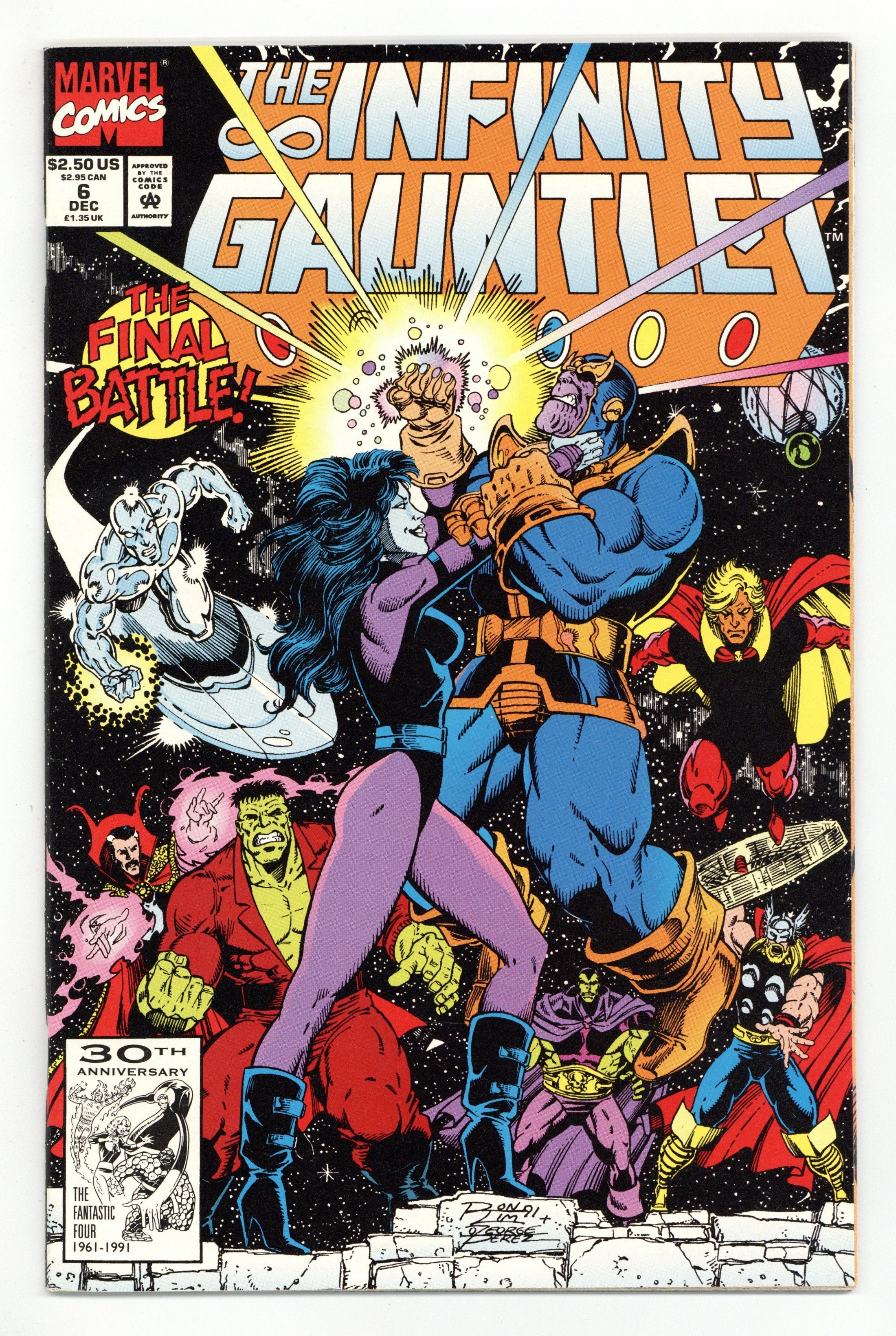 Tags: Infinity Gauntlet (part 6)$12.00Direct Edition. Part 6 of 6. "Power!" Story by Jim Starlin. Art by Ron Lim and Joe Rubinstein. The nigh-omnipotent power of the Infinity Gauntlet has fallen into the hands of Thanos' insane niece, Nebula. Now, the universe is maybe worse off now more so than before with such power at the disposal of such a scarred psyche. She has already swept aside the attack of Thor, Hulk, Drax, Firelord, and Doctor Doom as if they were but flies. All that stands in the way of the universe and ultimate annihilation is the man called Adam Warlock, Doctor Strange, the Silver Surfer, and the one who forged the Infinity Gauntlet, Thanos. Cover price $2.50.