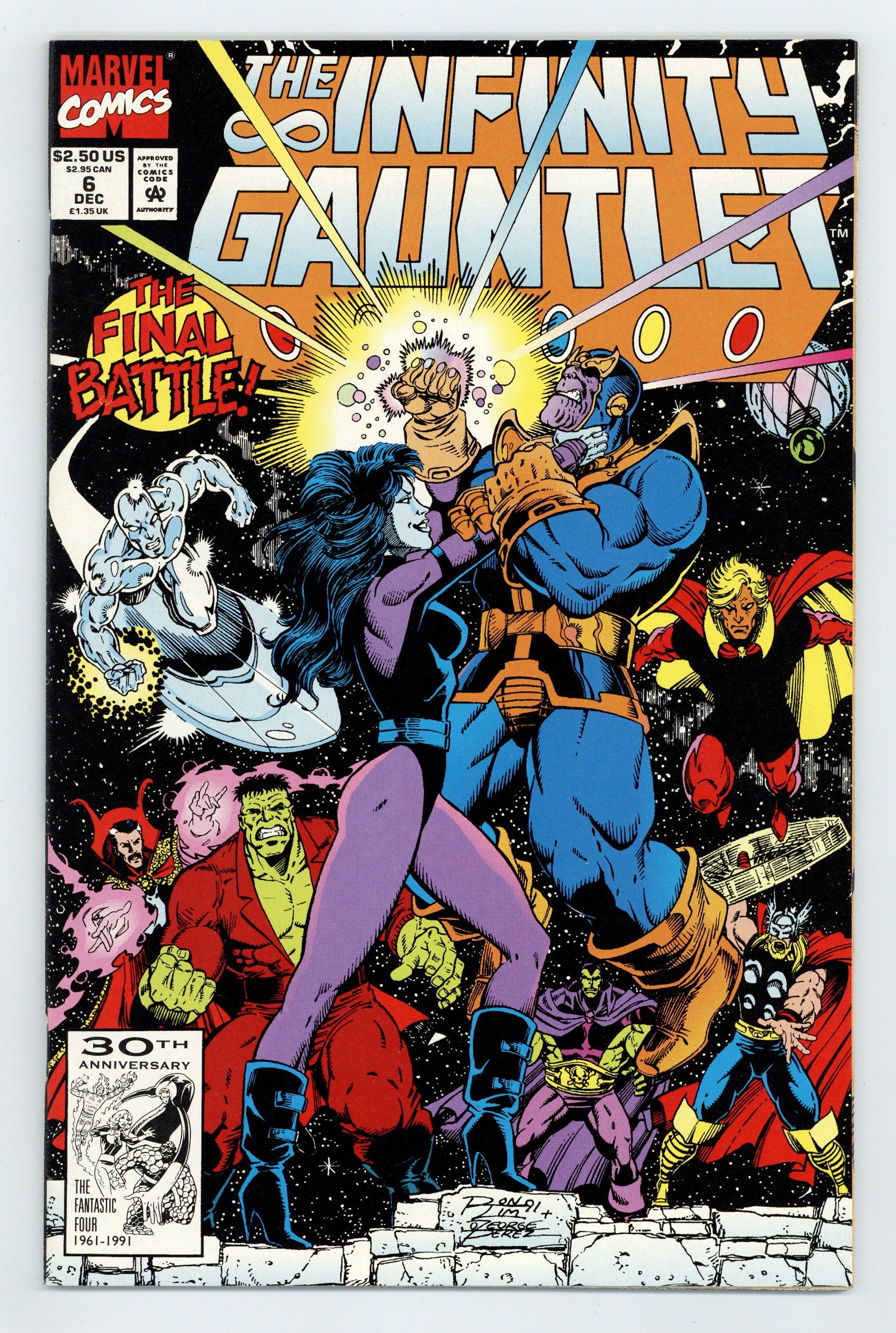 Tags: Infinity Gauntlet (part 6)$25.00Direct Edition. Part 6 of 6. "Power!" Story by Jim Starlin. Art by Ron Lim and Joe Rubinstein. The nigh-omnipotent power of the Infinity Gauntlet has fallen into the hands of Thanos' insane niece, Nebula. Now, the universe is maybe worse off now more so than before with such power at the disposal of such a scarred psyche. She has already swept aside the attack of Thor, Hulk, Drax, Firelord, and Doctor Doom as if they were but flies. All that stands in the way of the universe and ultimate annihilation is the man called Adam Warlock, Doctor Strange, the Silver Surfer, and the one who forged the Infinity Gauntlet, Thanos. Cover price $2.50.