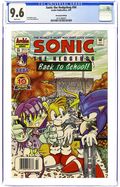 Newsstand Edition. Story by Karl Bollers and Ken Penders. Art by James Fry, Pam Eklund, Ron Lim, and Ken Penders. "New Order 2": As beautiful as the new Knothole Village is, Sonic just can't adjust to it knowing that Robotnik's presence and that of the Overlanders persists in Robotropolis. For his part, Elias has chosen the path of peace, electing to focus on turning Knothole into a permanent habitat rather than trying to reclaim Robotropolis. By issue's end, however, dark alliances shall be made and peril shall befall the Freedom Fighters in the form of both natural disasters and wicked enemies! It isn't long before Sonic gets a chance to switch back to "hero" mode! FC, 32pg Cover price $1.99.