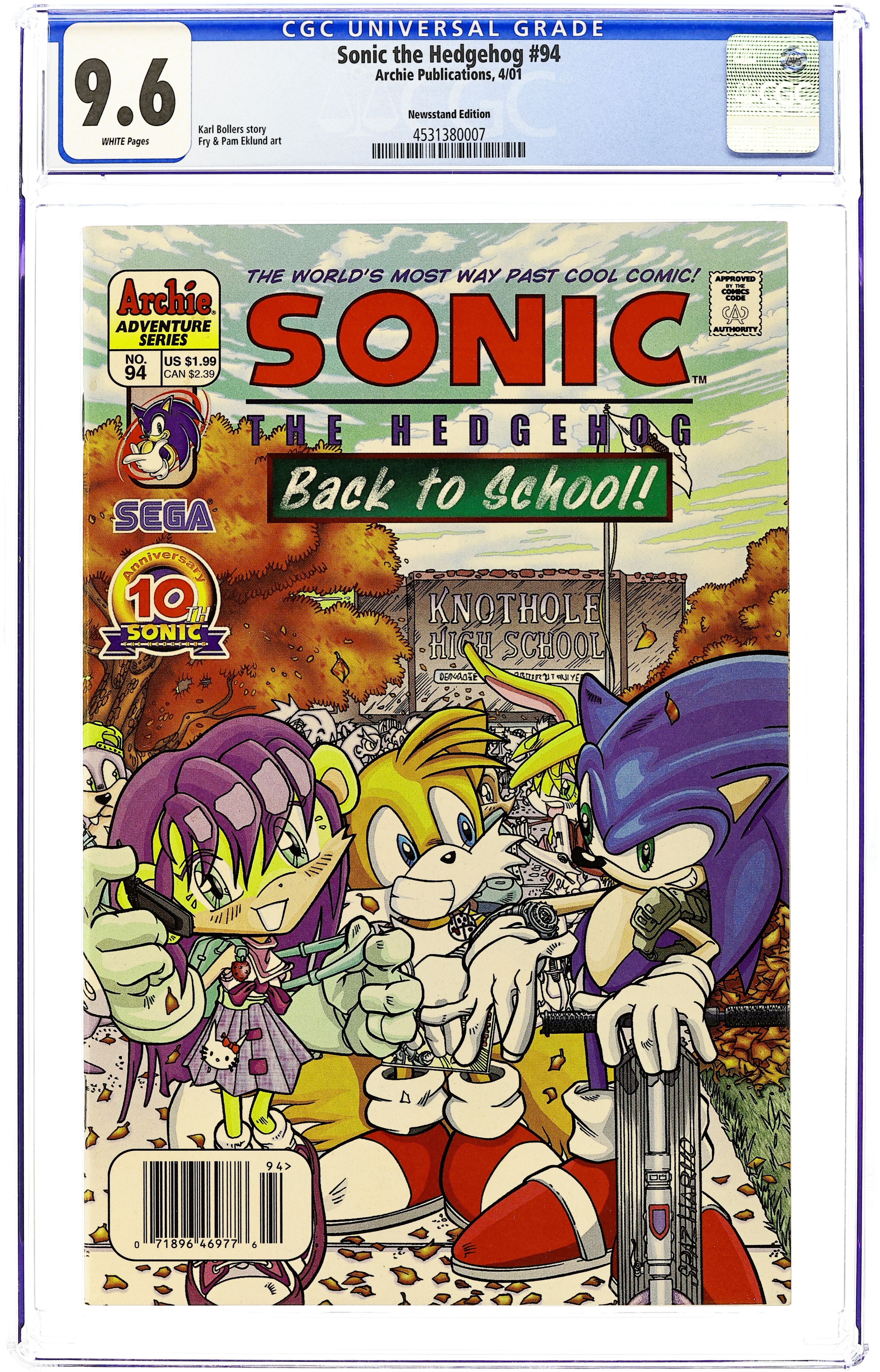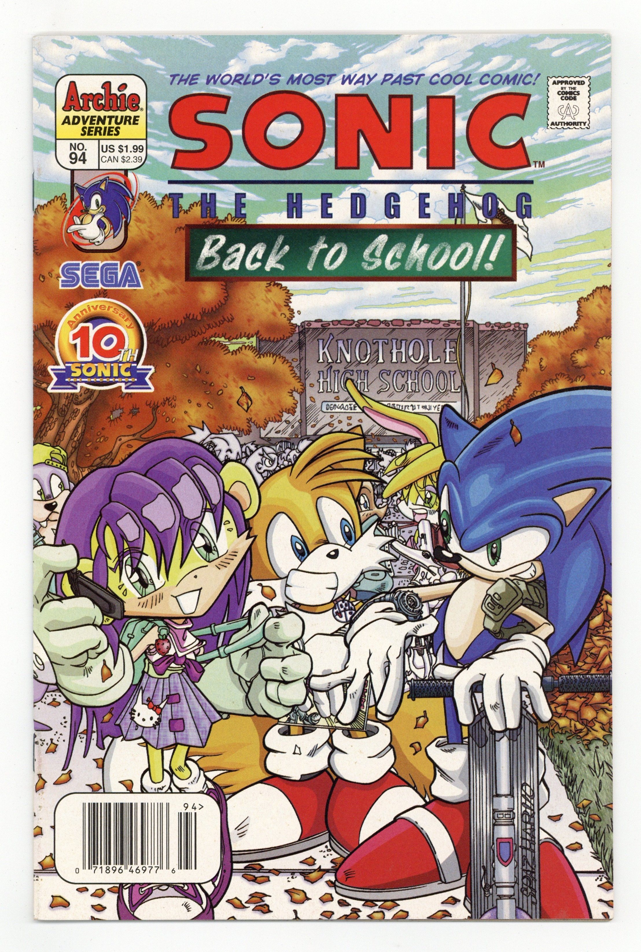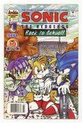 Published Apr 2001 by Archie Publications.$24.00Newsstand Edition. Story by Karl Bollers and Ken Penders. Art by James Fry, Pam Eklund, Ron Lim, and Ken Penders. "New Order 2": As beautiful as the new Knothole Village is, Sonic just can't adjust to it knowing that Robotnik's presence and that of the Overlanders persists in Robotropolis. For his part, Elias has chosen the path of peace, electing to focus on turning Knothole into a permanent habitat rather than trying to reclaim Robotropolis. By issue's end, however, dark alliances shall be made and peril shall befall the Freedom Fighters in the form of both natural disasters and wicked enemies! It isn't long before Sonic gets a chance to switch back to "hero" mode! FC, 32pg Cover price $1.99.